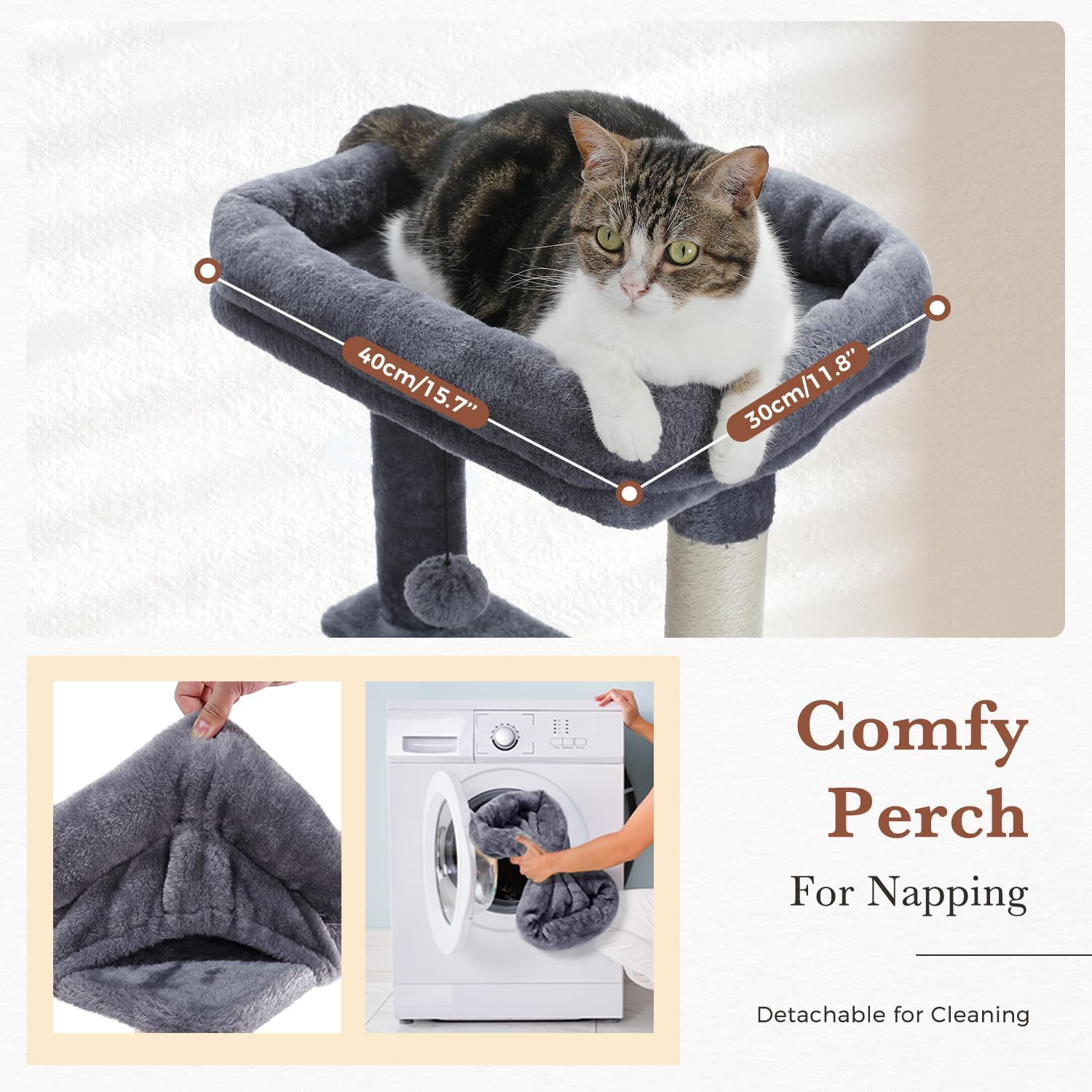 - Reasonable and Detachable: This sturdy cat tower comes with reinforced bottom base and vertical balanced design firmly support your naughty cats. Several posts connect the condos, perch, basket and platforms, making the entire cat tree more stable. And the interactive and detachable pompom can also attracts your babies flee through the whole tree all the time.