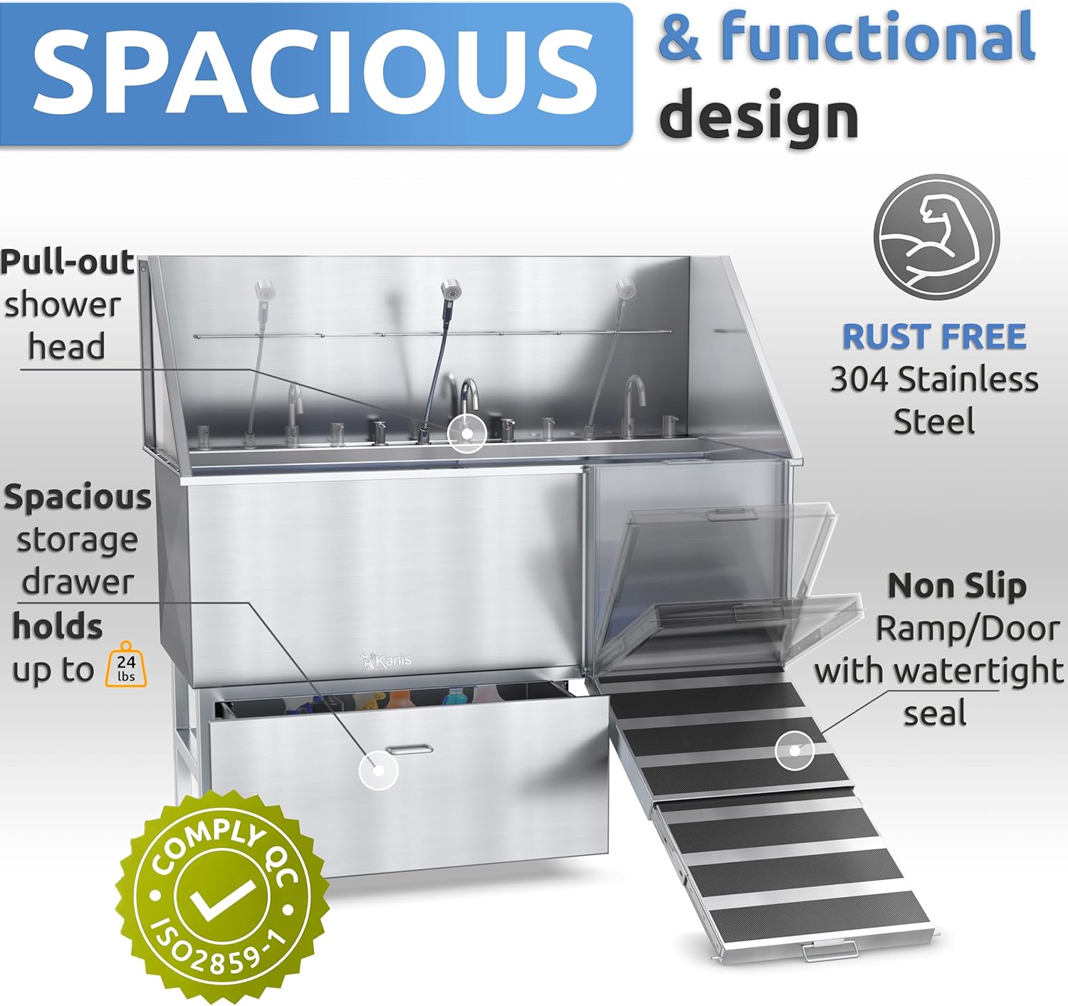 KANIS Professional Dog Washing Station - 304 Stainless Steel Pet Wash Sink & Grooming Bath Tub for Home with Ramp, Shower, Floor Grate, Storage Drawer, Faucet, Drain Kit for Large, Medium & Small Pets