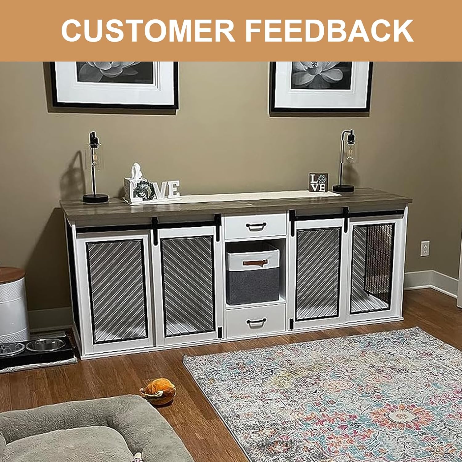 - Practical Design & Thoughtful Details - Our indoor dog house furniture has one drawer, one drawer feeder with 4 bowls and a big storage room for extra storage space. You can place pet supplies in it for easy use at any time. Also, the wide top perfect for magazines, family photos, favorite books, lamps, or other decorative items. With its double door latches, our dog crate furniture ensures that your dogs won't easily escape you're away.