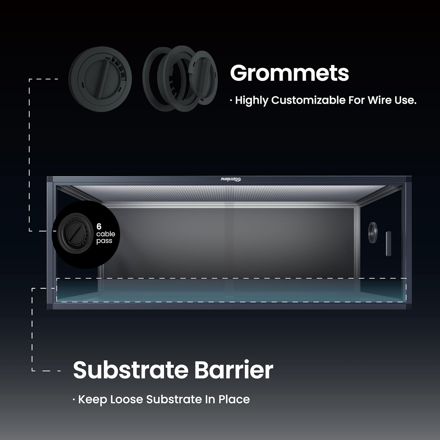 - γEasy MaintenanceγFront opening reptile terrarium with door handles included for easy cleaning & feeding. No more suction cup problems or unsightly fingerprints all over. The substrate barrier keeps the substrate in place. Our tempered glass doors are durable enough to withstand scratching.