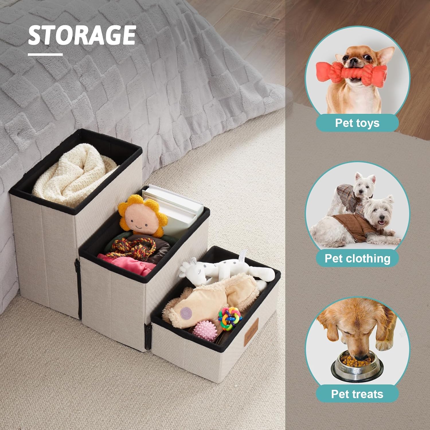- 【Dog Stair with Storage】NOTE: The stairs are designed for small pets. Each step features a convenient storage space, perfect for storing pet toys, clothes, snacks, and any other pet supplies or accessories. Each step is less than 5 inches high, making it especially suitable for puppies or pets with knee injuries. NOTE: Be sure to verify that the size of the dog stairs is appropriate for your needs before purchasing.