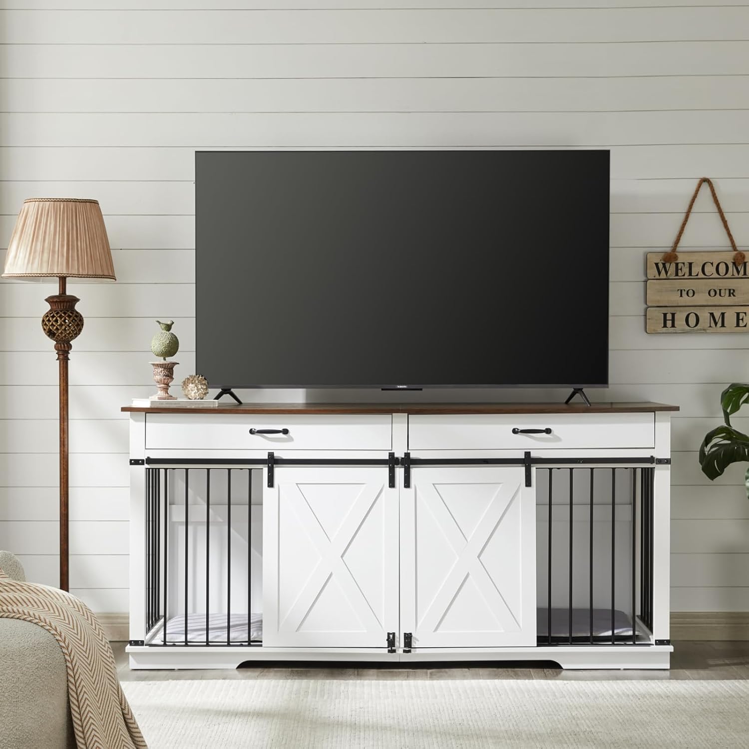 - Farmhouse Furniture Style Double Dog Crates: Overall Size: 72.5"L x 23.6"W x 34.3"H. Featuring barn doors, farmhouse and bracket decor, the dog crate furniture is both modern and casual feel; minimalist design blends easily with existing interiors wherever it is placed