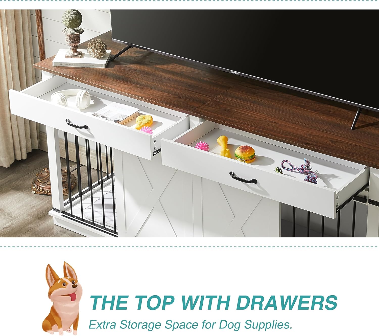 EDYO LIVING 72.5" Large Dog Crate Furniture for 2 Dogs, Wooden Dog Kennel with Drawers, Divider, Sliding Barn Door, Water Resistant Indoor Furniture Style Double Dog Crates, White