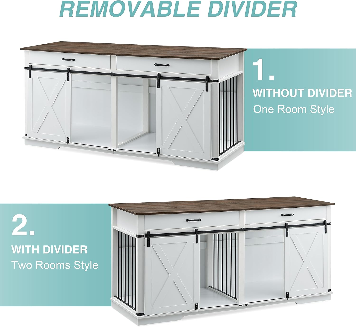 - Removable Divider Design: The removable divider design makes the dog cage more creative; when the divider is placed the inside of the crate is divided into two separate spaces, turning it into two crates instantly; for larger dogs, simply remove the divider to comfortably accommodate them and give them a large space to move around