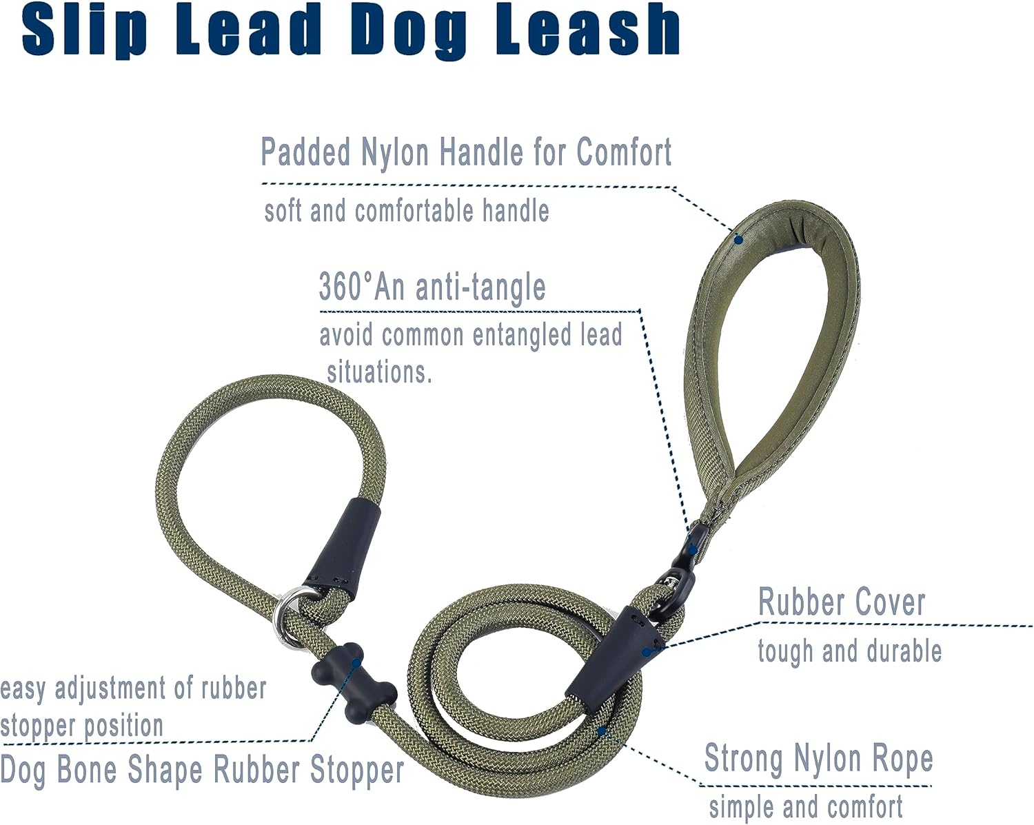 Slip Lead Dog Leash,Strong Nylon Rope Leash and Padded Handle,No Pull Outdoor Walking Training Lead for Small Medium Large Dogs(Army Green,1/2"×4ft)