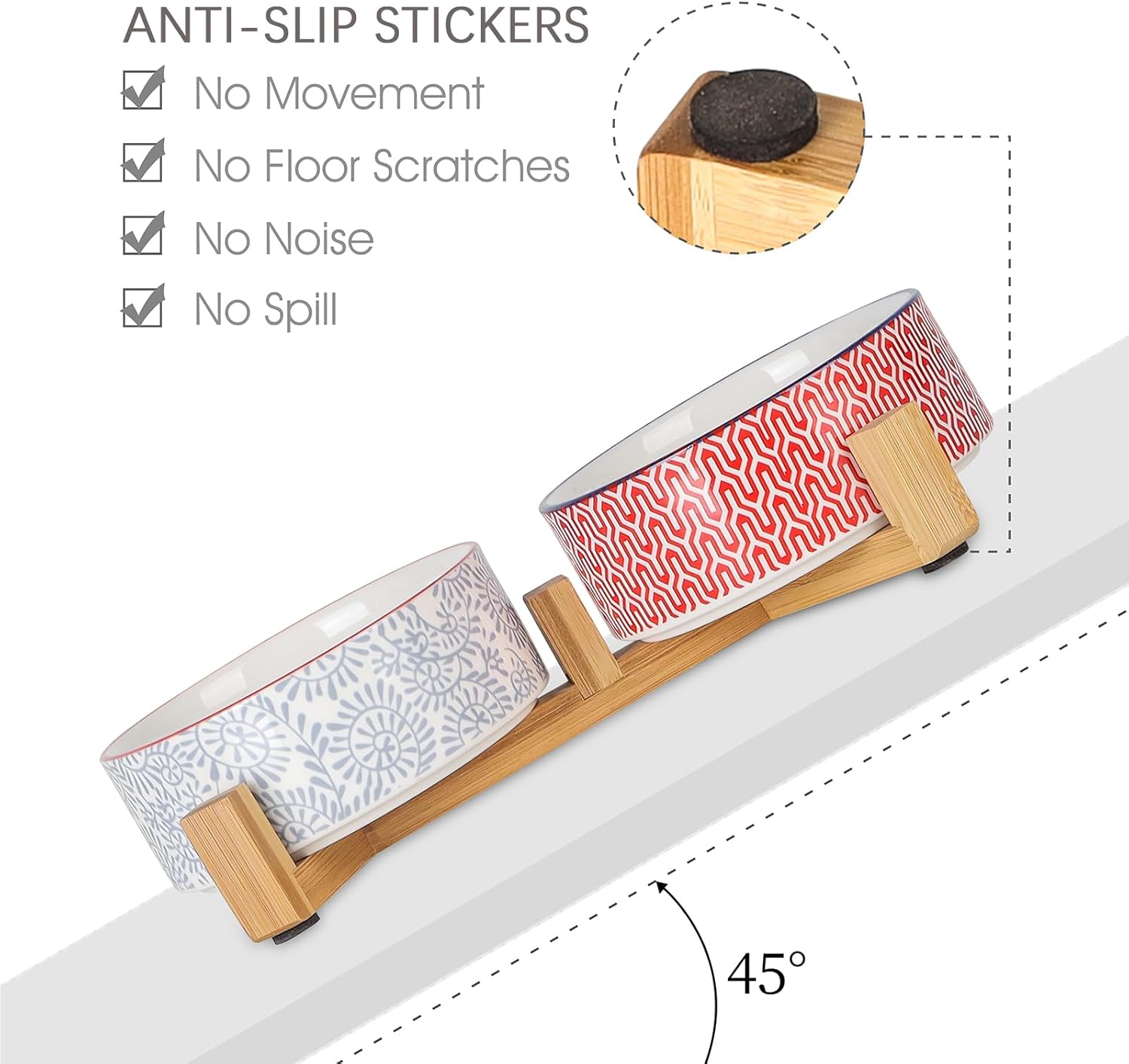 - NON-SLIP & ANTI-SCRATCHED WOODEN STAND BASE- Each pet bowl set is paired with Non-skid pads that can stick under the wooden stand and also avoid scratching the floor. This triangle stand has a certain weight base that can keep the dog bowls set to stay in place and never move around.