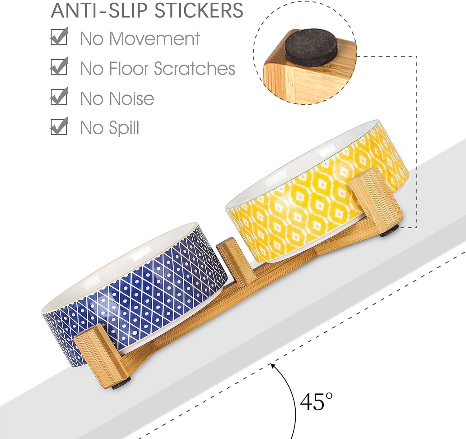Selamica Ceramic 30 OZ Dog Bowls with Wooden Stand, Anti-Slip Dishes Set for Cats and Small Dogs, Weighted Bowls in Assorted Colors