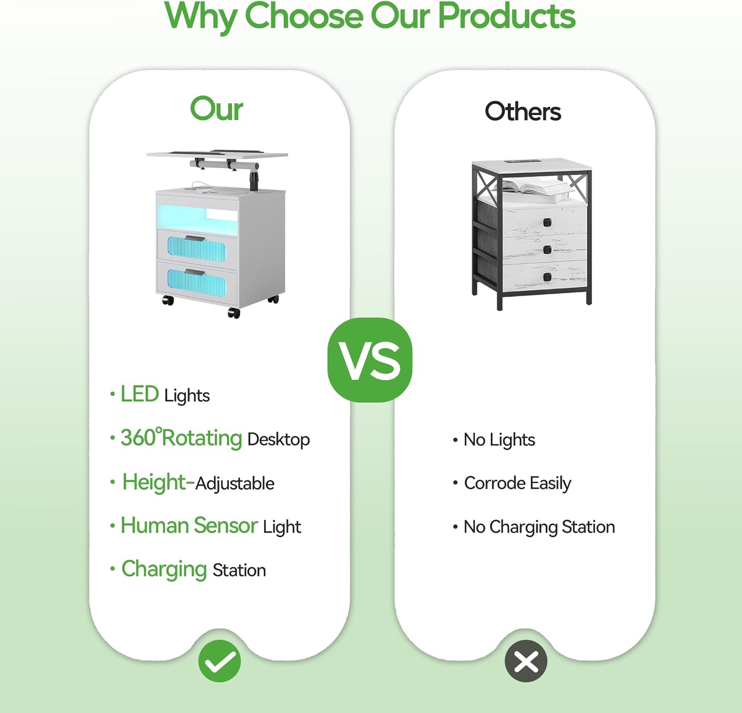 - β γLarge Capacity Spaceγ The led nightstand provides spacious storage for nighttime essentials. There is a swivel desk; Open storage shelves; 2 drawers,The desktop can hold everyday items and keep them within reach.