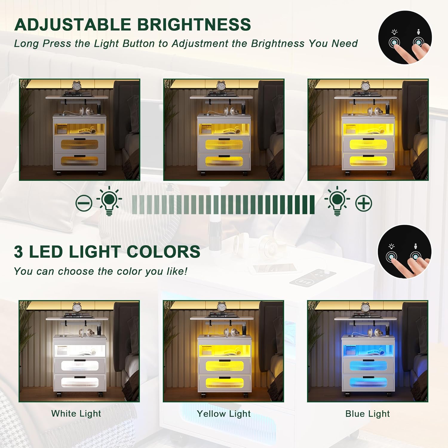 HNEBC Nightstand with Wireless Charging Station, LED Nightstand Has Adjustable Rotary Workstation,Smart Night Stand with 2 Drawers,Modern Bedside Table for Bedroom, Sensor Light/Wheel (White)