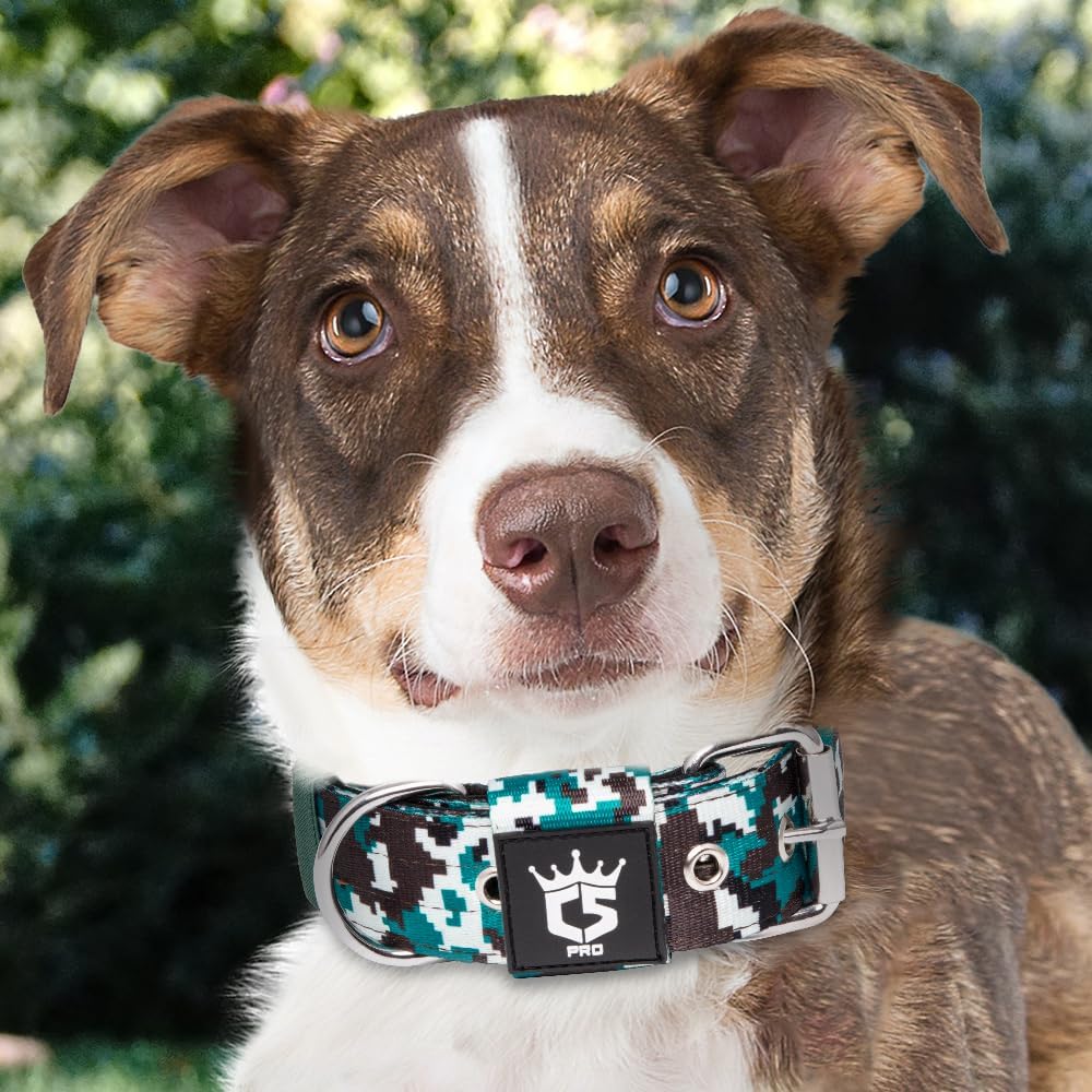 TSPRO Tactical Dog Collar 1.5 Inch Wide Thick Dog Collars with Heavy Duty Metal Buckle, Durable, Strong, Adjustable for Medium to Large Dogs (Camo Cyan L)