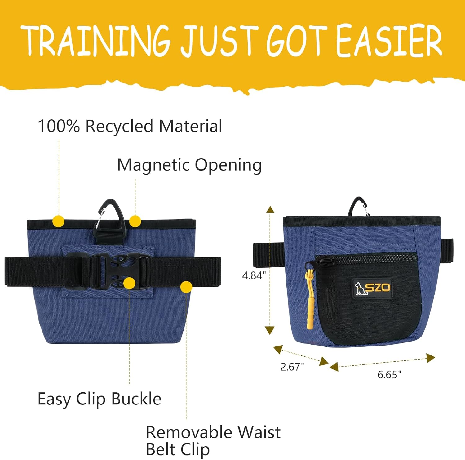 - Easy To Use — SZO dog treat pouch is designed to fit your everyday use when training your pets. It features a magnetic closure, allowing quick and one-handed access to your pet's favorite treats. And a front zipper pocket to secure personal items!