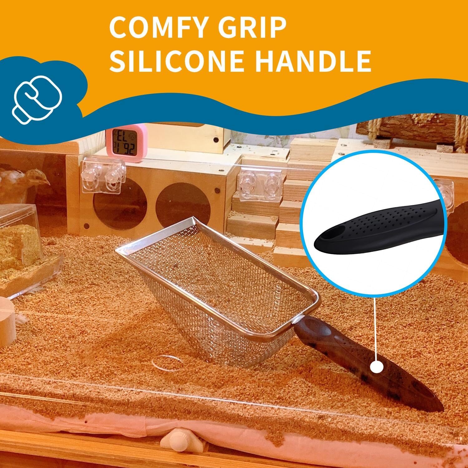 - The sand litter scoop is made of high-quality stainless steel mesh。Ergonomically designed,the handle is made of top-grade material,comfortable and non-slip.