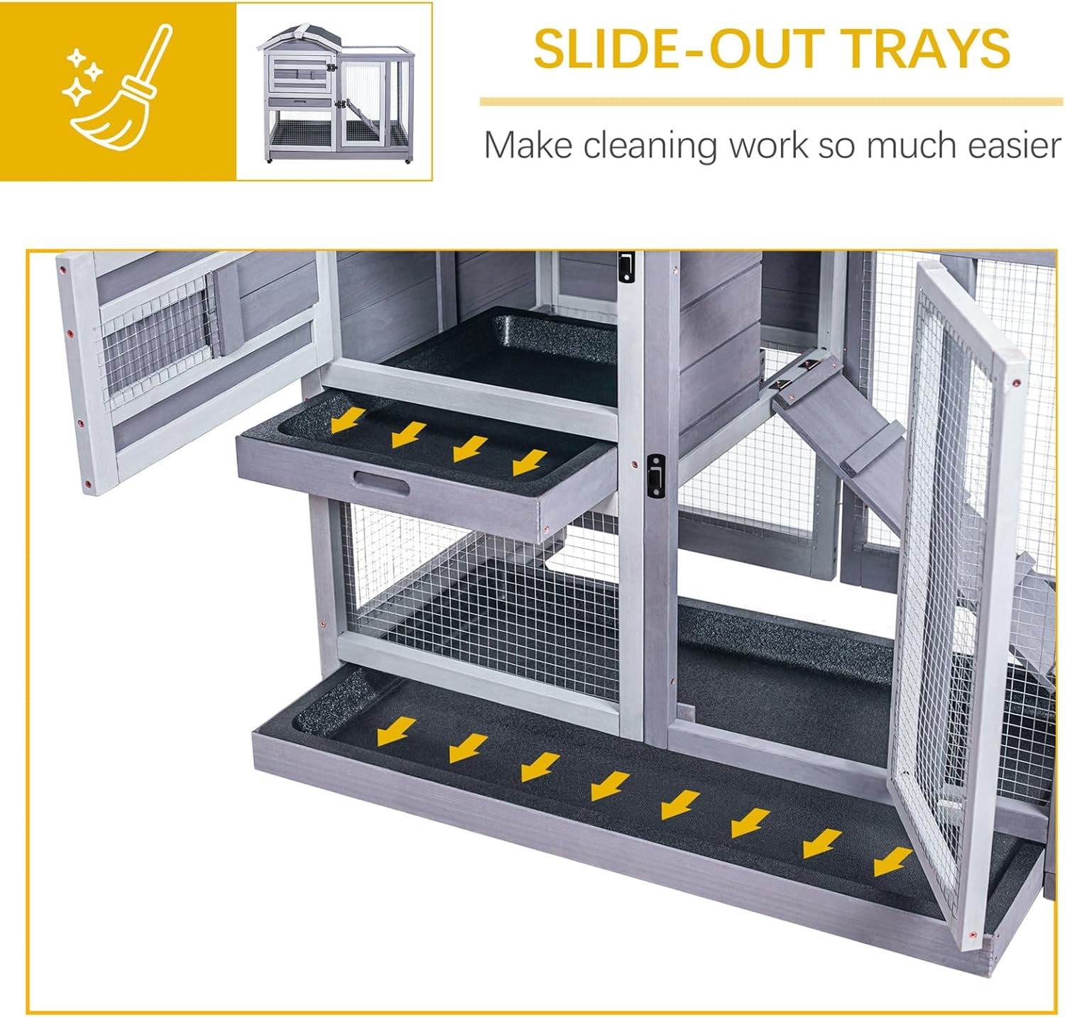- 🐇【Effortless Cleaning】- The large rabbit hutch includes a removable tray, simplifying cleanup. Slide out the tray, dispose of waste, and rinse it clean – maintaining a hygienic environment for your pets has never been easier.