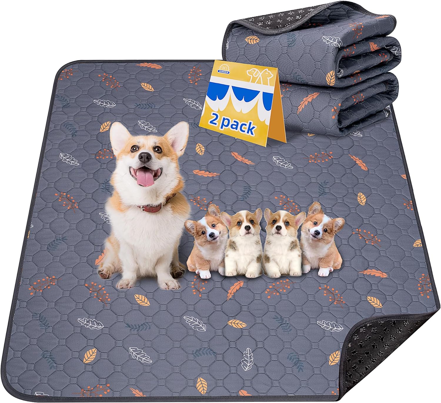 Sunheir Washable Pee Pads for Dogs 2-Pack Reusable Puppy Pads Pet Training Pads, Waterproof Dog Pee Pads for Crate, Whelping Pad, Non-Slip Protects Against Urine Leakage (Leaves - Deep Grey, 31x36)