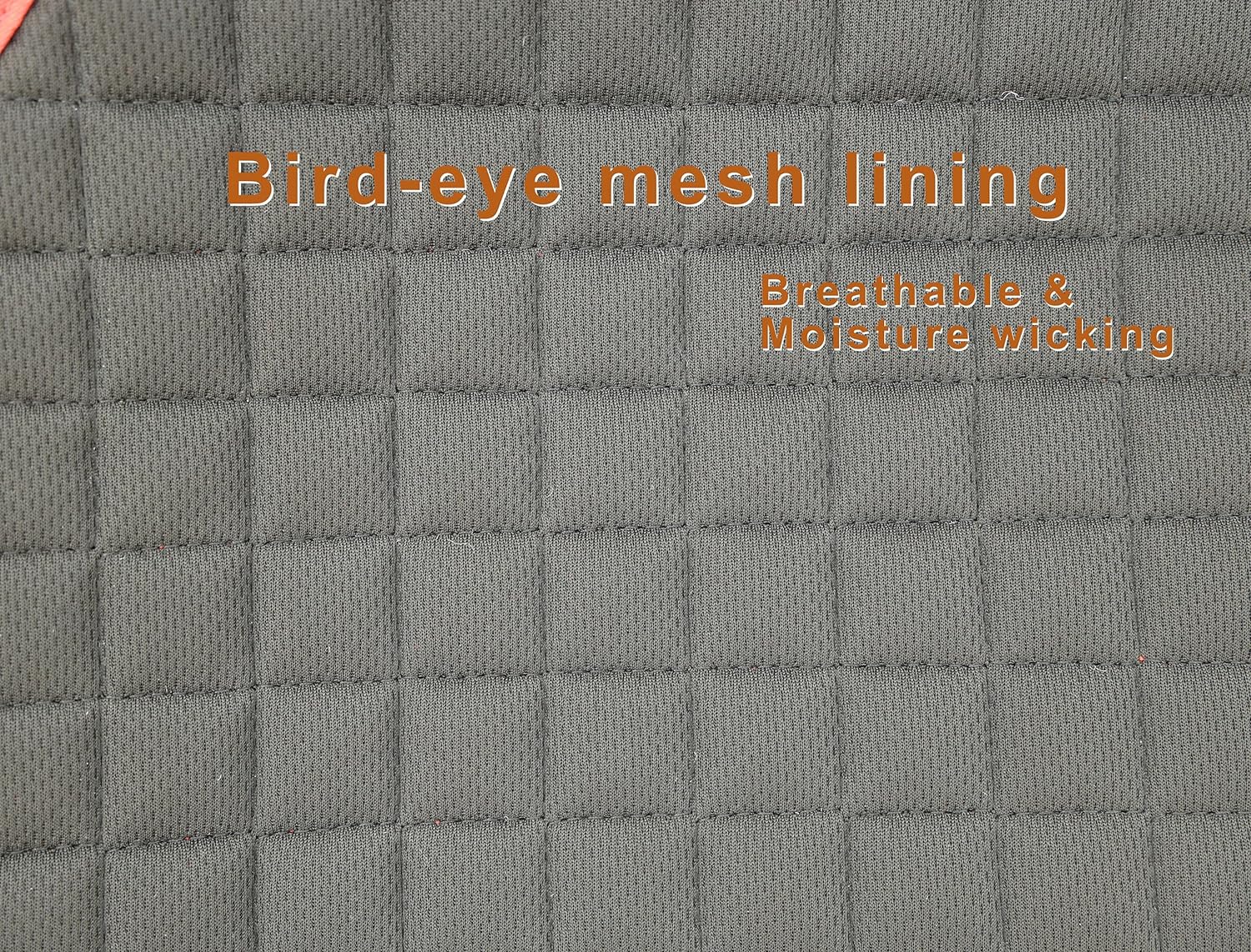 • The bird-eye mesh cloth as lining effectively controls heat and sweat, efficiently wicking away moisture. The pique surface helps keep it from slipping.