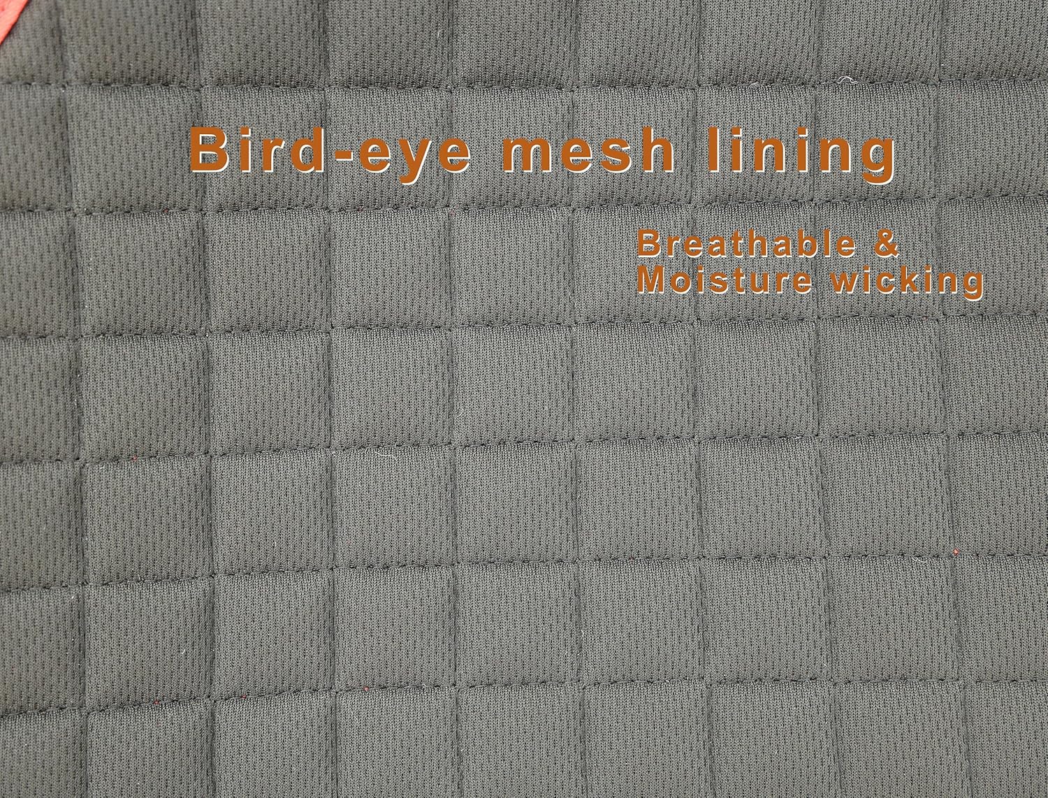 - The bird-eye mesh cloth as lining effectively controls heat and sweat, efficiently wicking away moisture. The pique surface helps keep it from slipping.