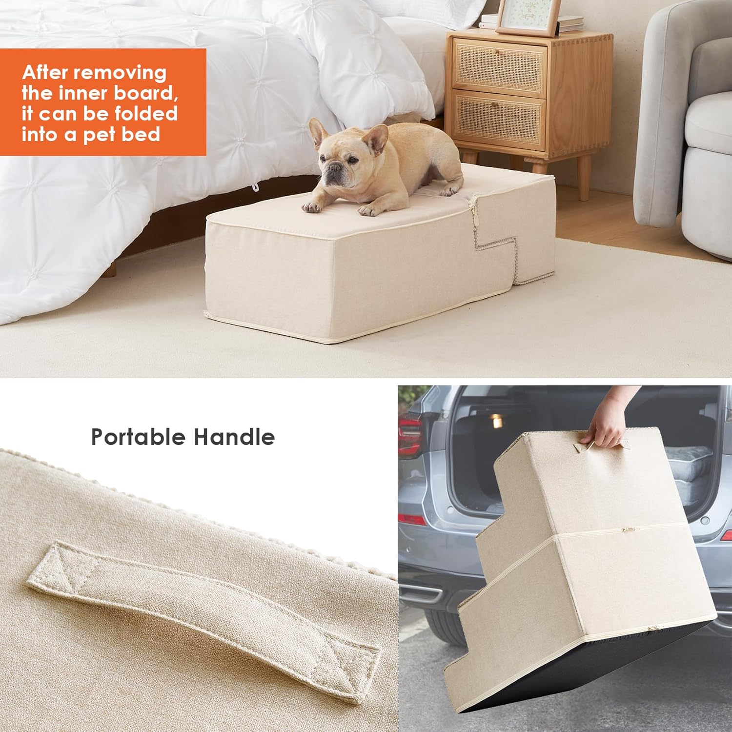- STEADY & FOLDABE: With a 30D high density foam and eco-friendly support board, this dog stair offers enhanced stability. It can also be folded into a basic dog bed for your furry puppy to sleep.