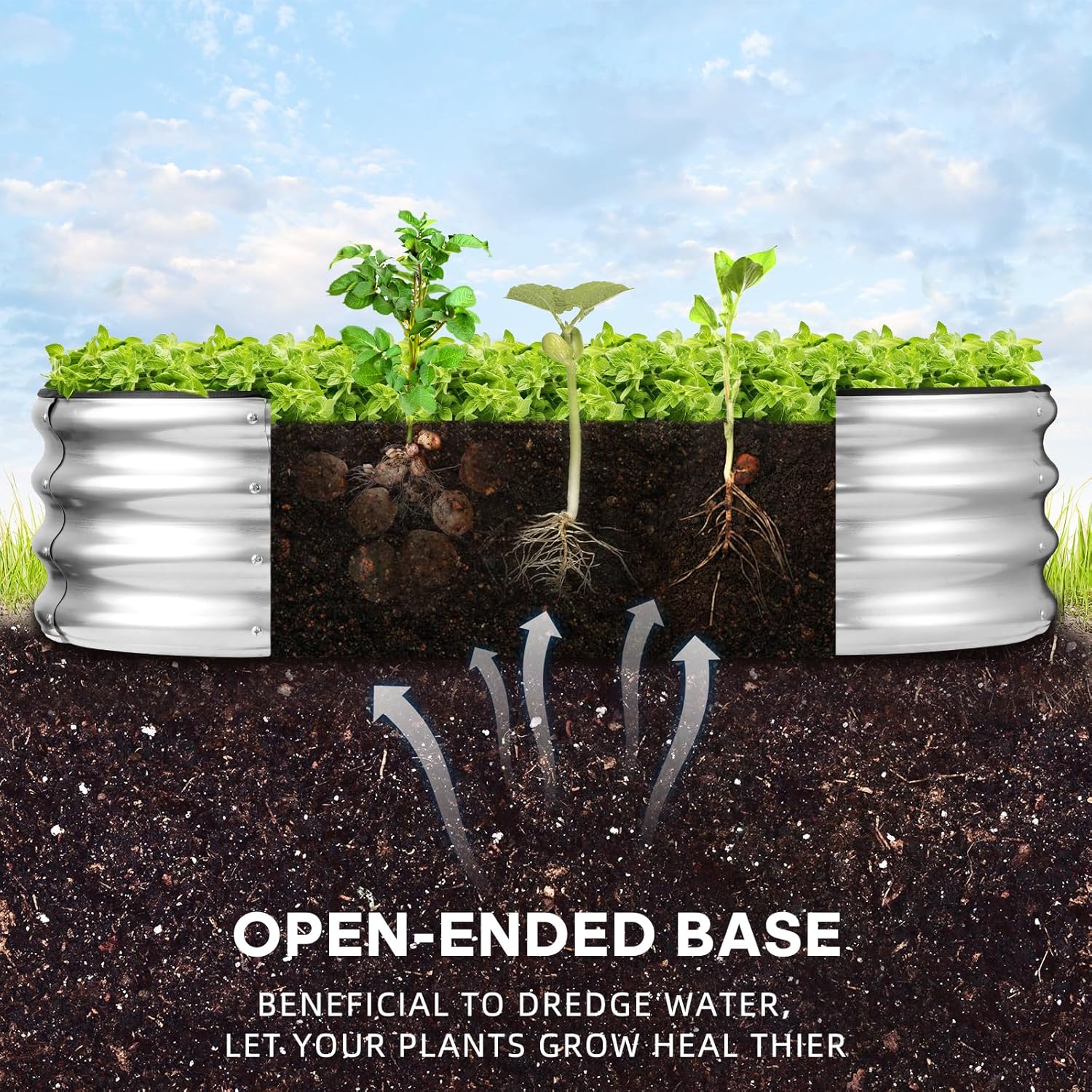 - Open base: This raised garden bed metal galvanized is designed with an open base, Sits on the ground garden bed which can effectively avoid water accumulation .