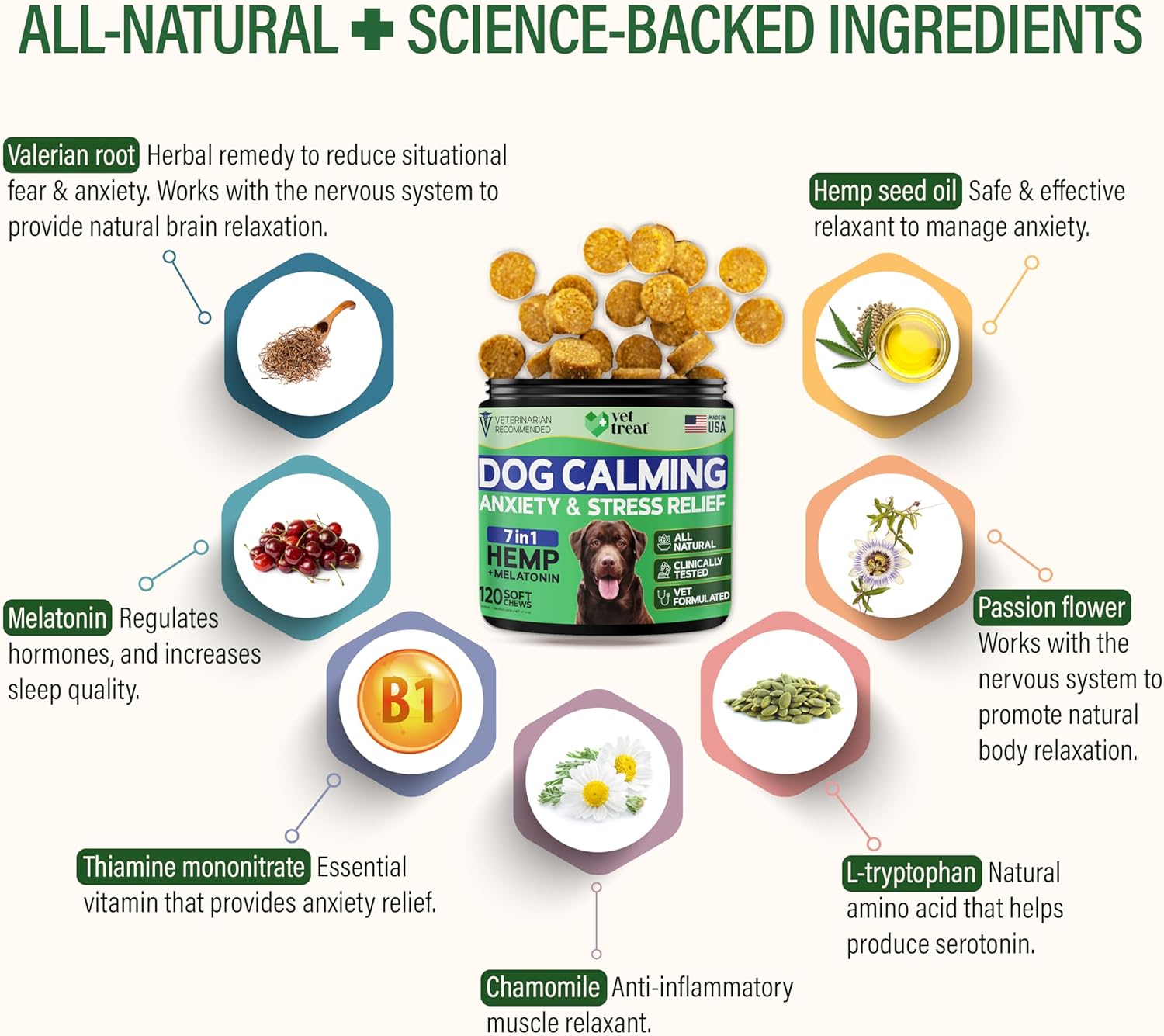 - Premium Natural Ingredients β Vet Formulated: Formulated by veterinarians, these dog calming chews - anxiety relief treats feature natural herbs and hemp for dogs to reduce anxiety and promote well-being β with no artificial fillers, corn, or soy.
