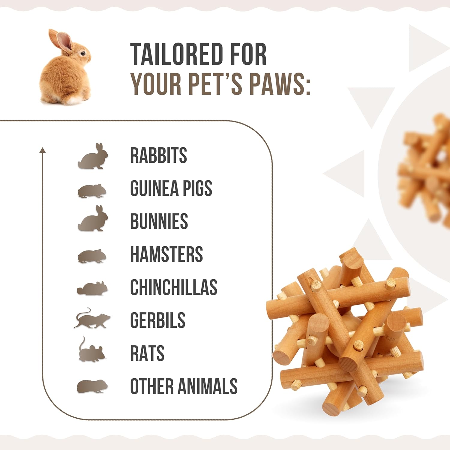 - Help for Tooth: Providing small animals with wooden chewing toys can help divert their natural chewing behavior away from potentially harmful objects and can protect the healthy growth of rodent pets' teeth
