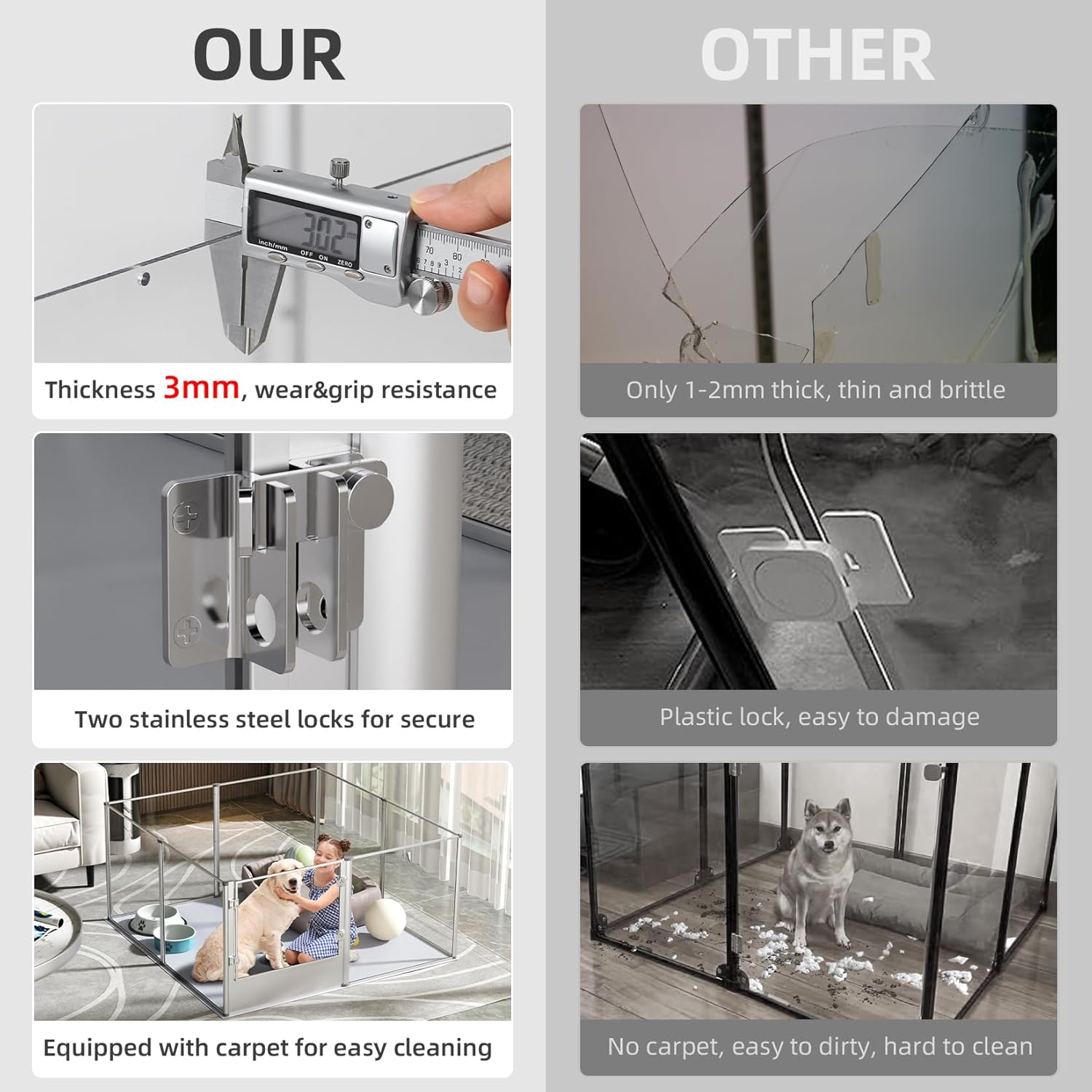 - 32"Tall & Innovative Material - Compared to the metal and wood fences,our fence is heighten and lengthen,32"tall and 52"long,also a new innovative acrylic fence design,perfect blend of high-transparency acrylic panel and anti-oxidant aviation aluminum frame for a high class look,offering functionality and style, overall weighs 48lbs with nonslip pad,effectively prevent dogs from jumping out and pushing,large spacious space to keep dog mom and puppies safely contained
