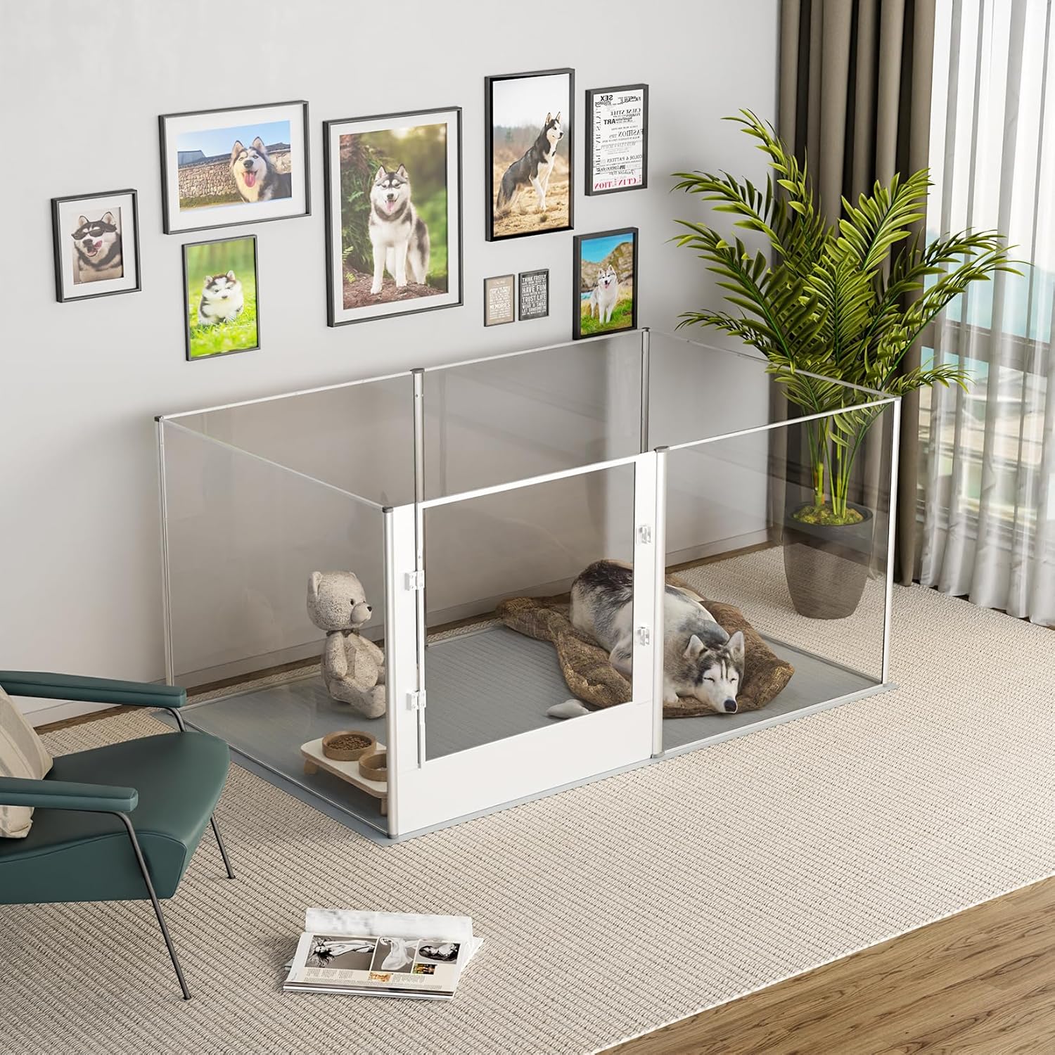 - Clear Acrylic Fence Design - Crystal-clear acrylic dog fence playpen enables you can interact with your pets closely, 360Β° high transparency and wide vision, itβll relieve your pets from anxiety, they also make sure you are by their side, equipped with a door for dog mom/ pets to come and go easily, so this is a unique gift for your loved friends, get this fence in the room, instantly improve the overall interiors