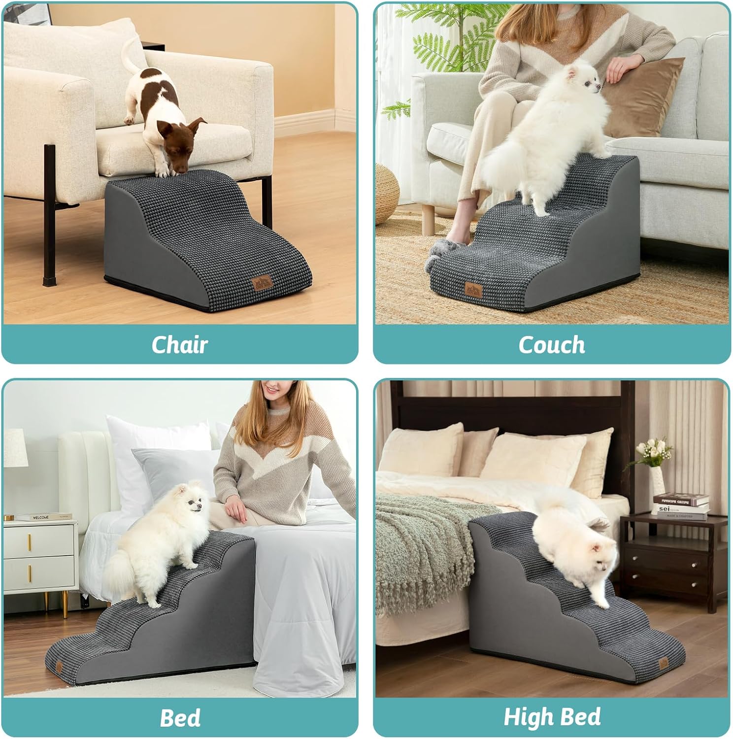 - NOTE & CHOOSE: This staircase is not suitable for large dogs. The inner foam is not washable. Note: Please cover the cover before the sponge is fully fluffy to avoid being unable to cover. 2 layers are suitable for chairs, 3 layers are suitable for sofas or couches, 4 layers are suitable for beds, and 5 layers are suitable for high beds or cars. Please be sure to confirm whether the size is suitable for you first