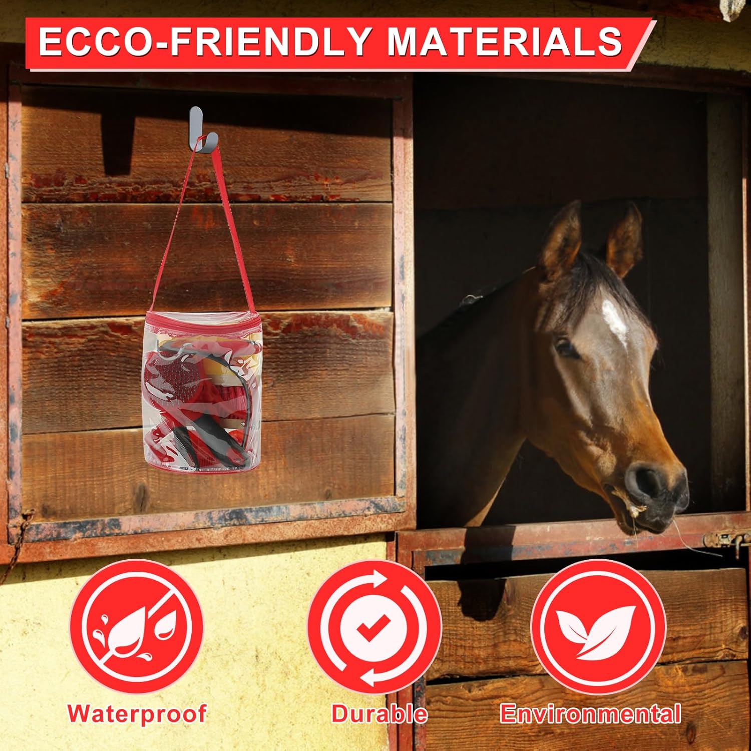 - 9 Pieces package contains:The horse grooming supplies, includes a horse grooming tote bag, a oval massage curry, a hard brush, a soft brush, a sweat scraper, bathing sponge, a hoof pick , a mane comb and a tail comb