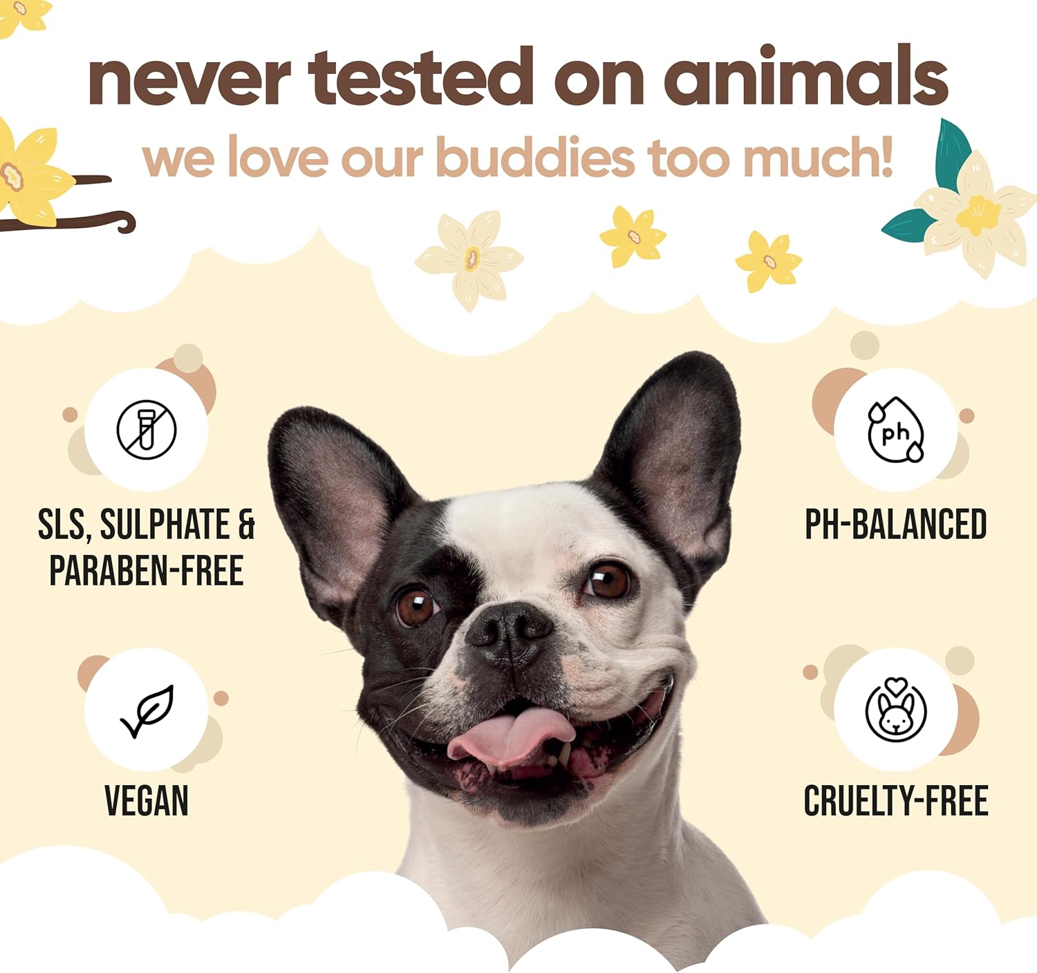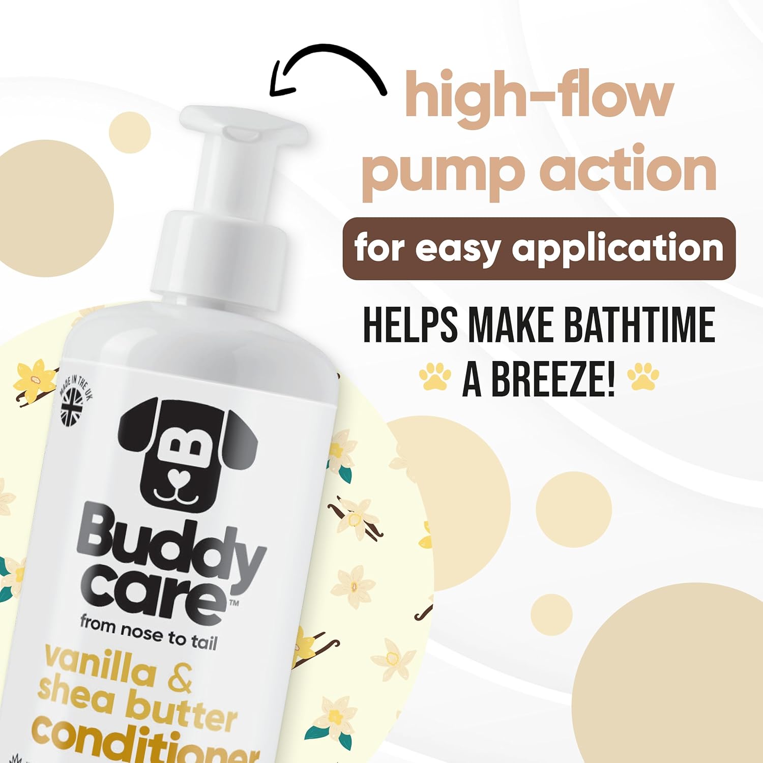 - SOOTHING DOG CONDITIONER β Buddycare soothing, detangling vanilla and shea butter dog conditioner works alongside our range of dog shampoos and is the ideal final step in your petβs grooming routine. Simply massage into your dogβs wet fur after our cleansing dog shampoo, focusing on the matted and tangled areas. Rinse thoroughly with warm water and towel dry for a clean, comforting vanilla scent and silky-soft finish.