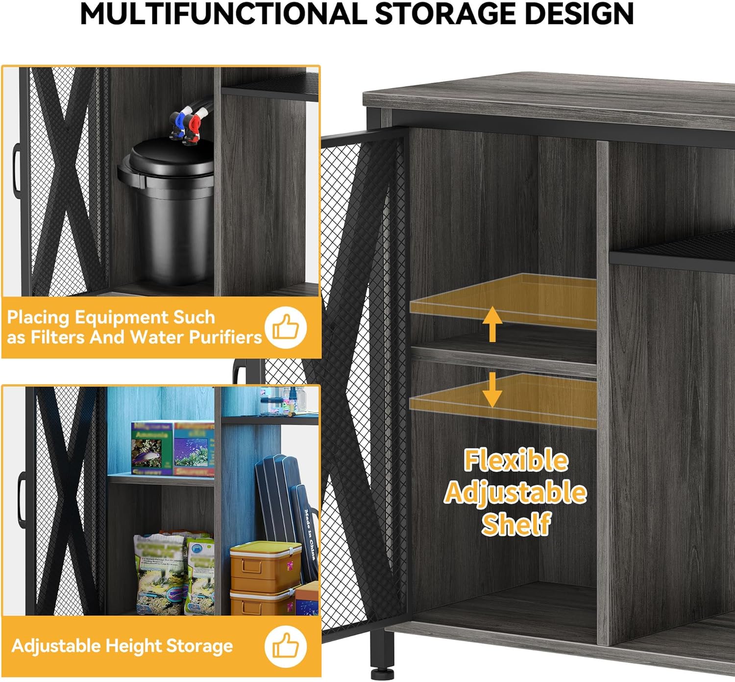 - Orderly storage: This fish tank with stand easily keeps everything organized. The built-in cabinet stores fish food, cleaning tools, and other accessories while the adjustable shelves help accommodate items of various sizes