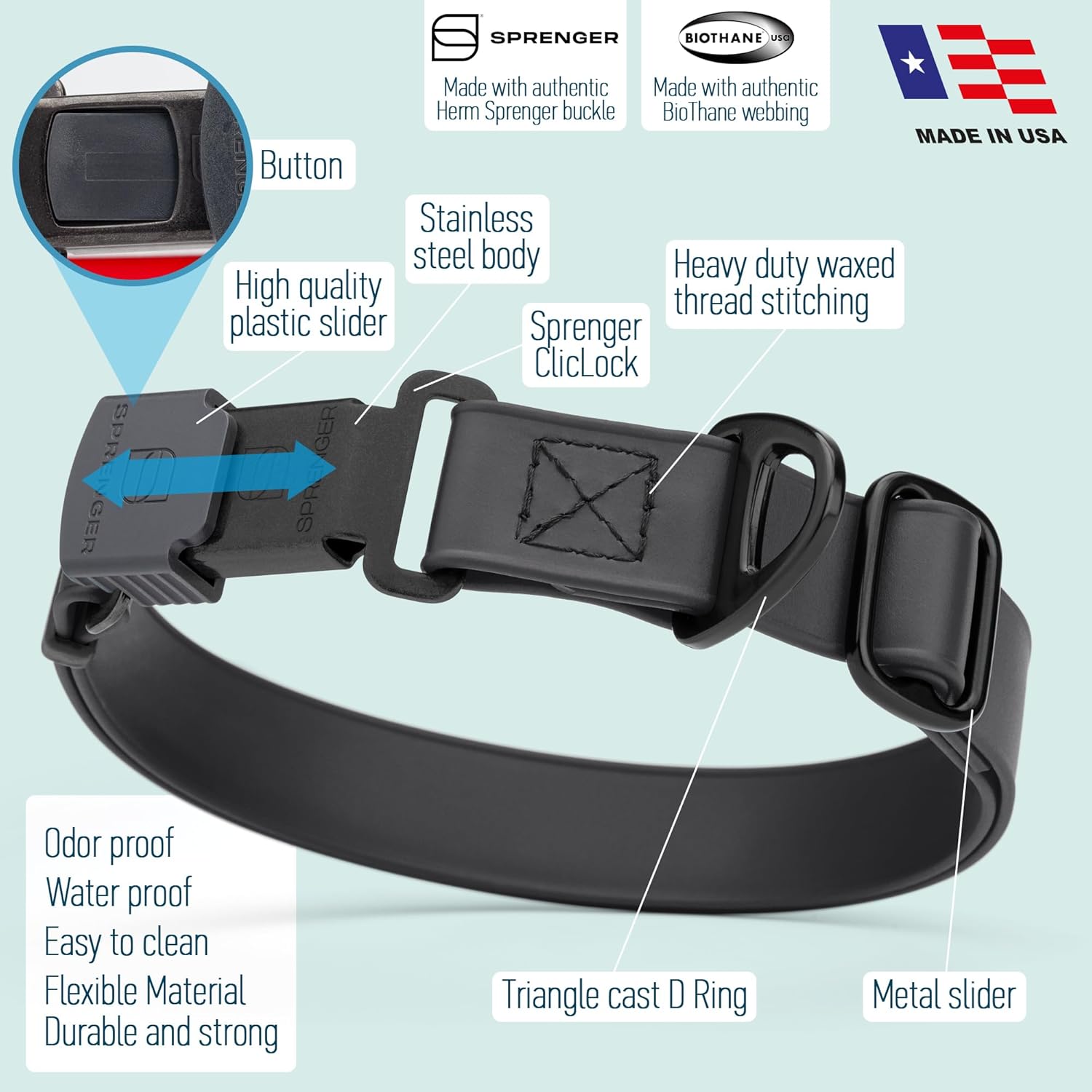 - Made to Last: Our tactical dog collar is proudly made in the US, employing premium quality materials, a combination of authentic biothane webbing, heavy duty waxed thread stitching, stainless steel welded D-ring with quick release buckle. This collar is designed to withstand the test of time, extreme hot and cold temperatures, water, swimming, snow and more!