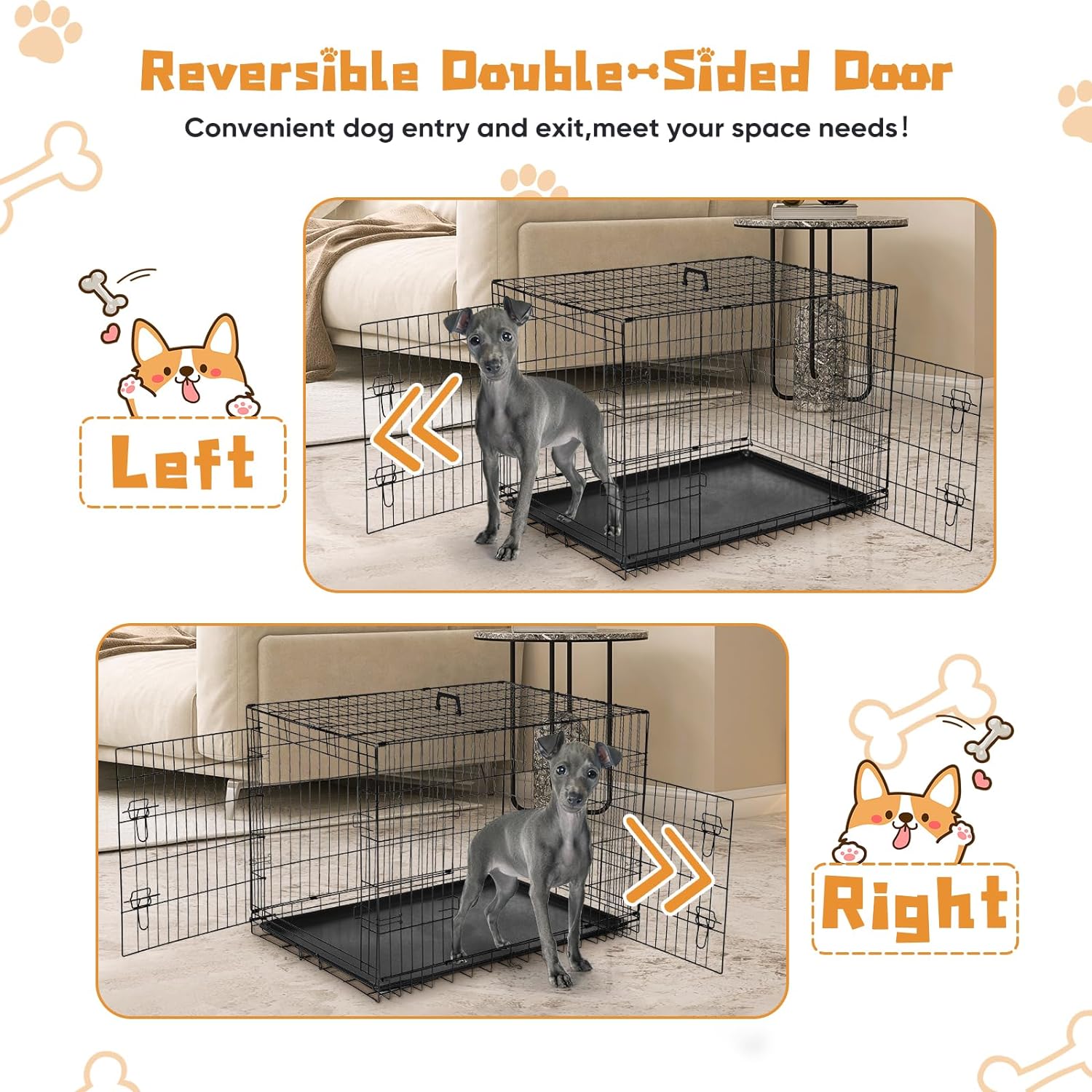 - 【DOUBLE-DOOR DESIGN】 Two-door access provides front and side door access for proper ventilation and interaction with you. Large door opening and low threshold, allows your pet easily enter and exit the crate. Each door comes with a heavy-duty sliding bolt latch to securely lock it in place to keep your pet safe.
