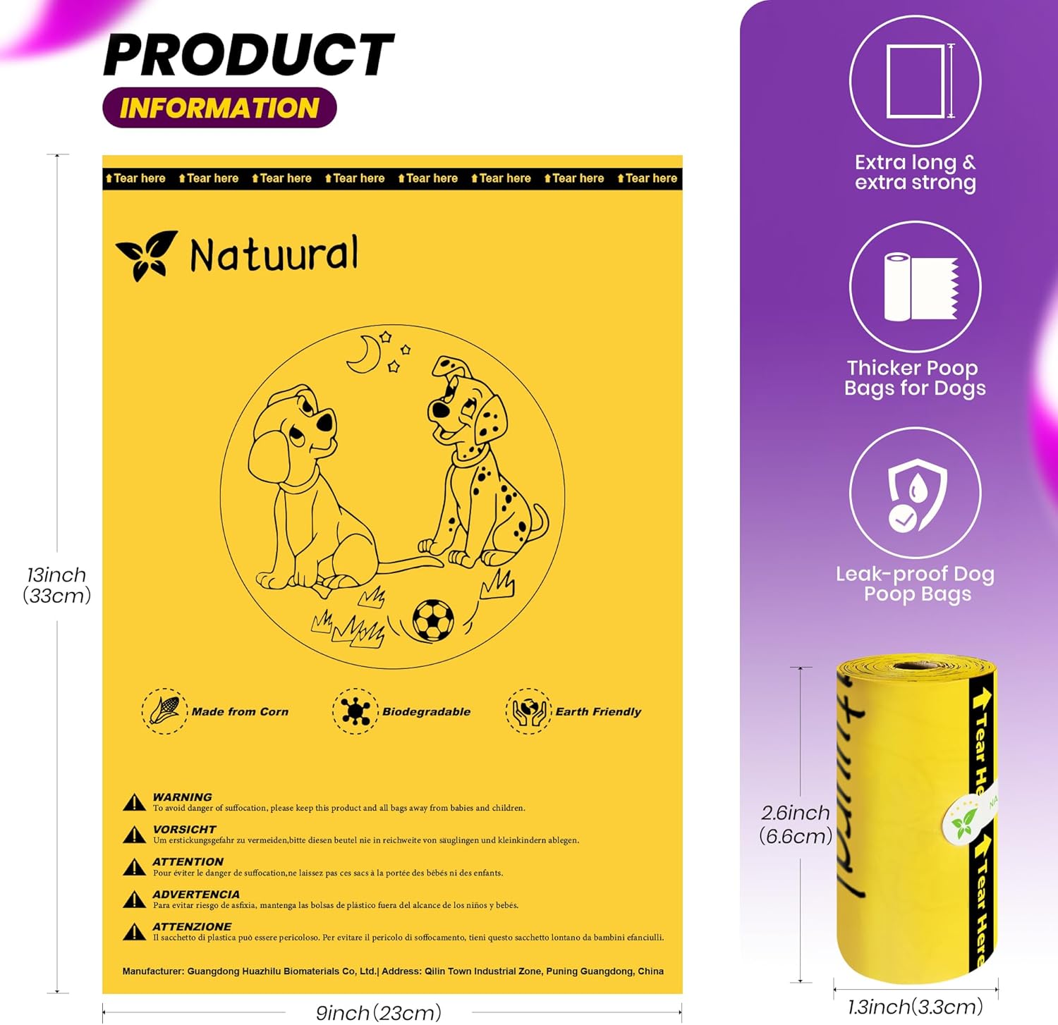 - Practical Poop Bags: Biodegradable poop bags size: 9Γ13 inches, Extra thick strong and easy to open, they are suitable for dogs of all sizes. Dog poop bags can also be used for cat poop cleanup, dirty baby diapers, food scraps.