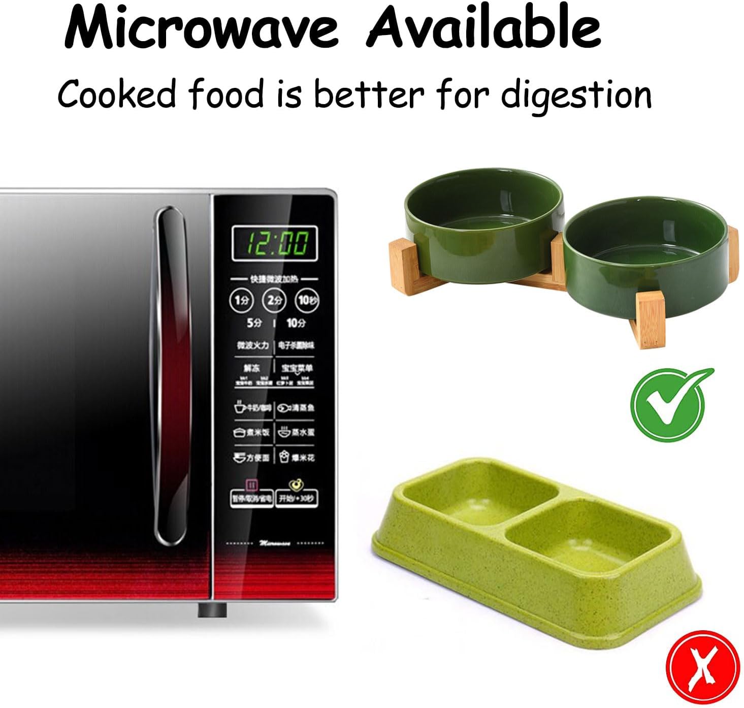 - EASY TO CLEAN CERAMIC - This easy clean dog bowl set is dishwasher proof, as well as easy to handwash and wipe down. With thick walls, these ceramic bowls for pets are sturdy, weighty yet not too heavy. Double Bowl Design:One dog bowl for food and one for water, Each ceramic cat bowl has a Unique wooden stand, raising the dishes closer to your pet for more comfortable eating