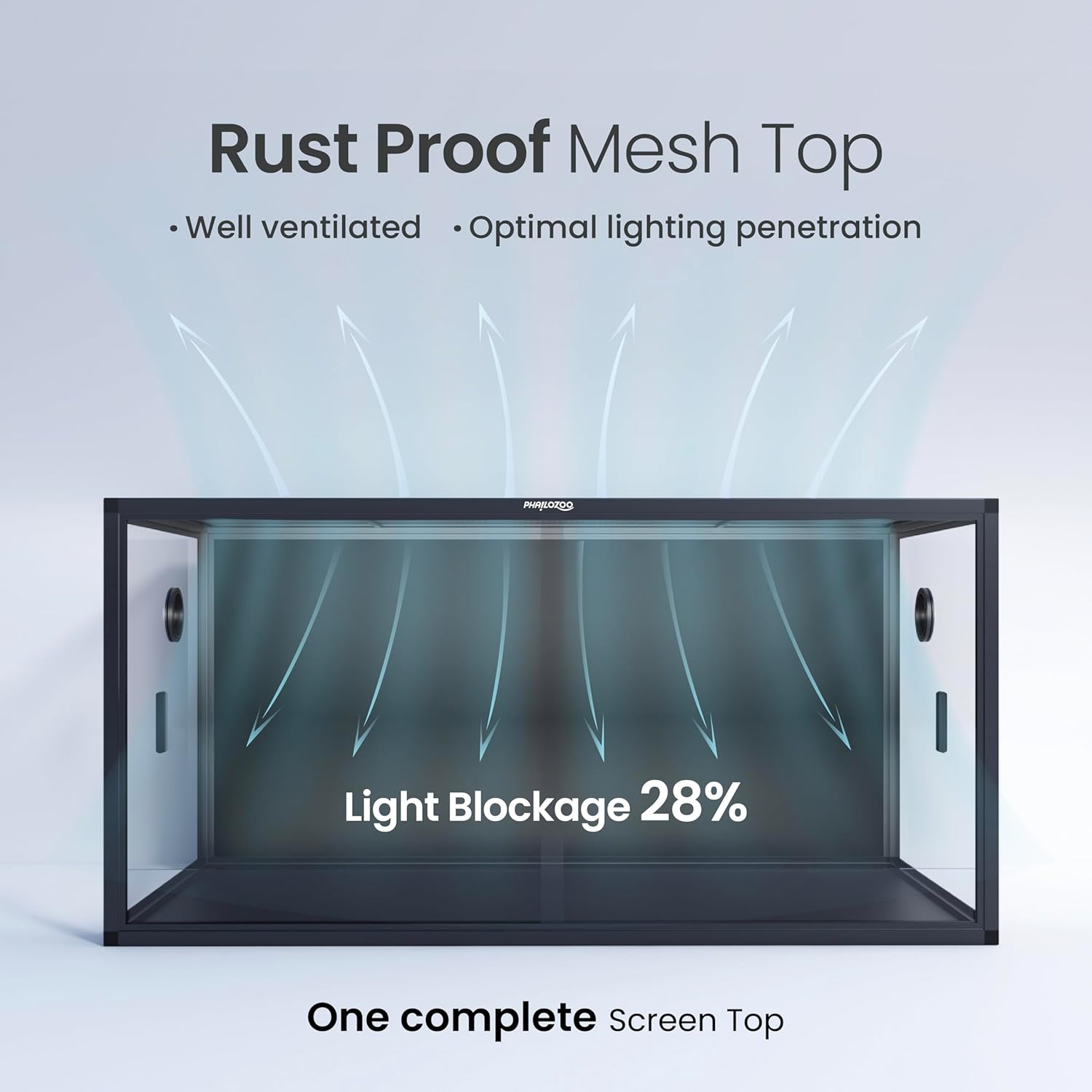 - γWorry LessγNO GAPS FOR ESCAPING with fully closed structure. Rigid tempered glass doors with tiny door gaps. Rust proof top screen ventilation allows better air circulation and optimal lighting penetration.