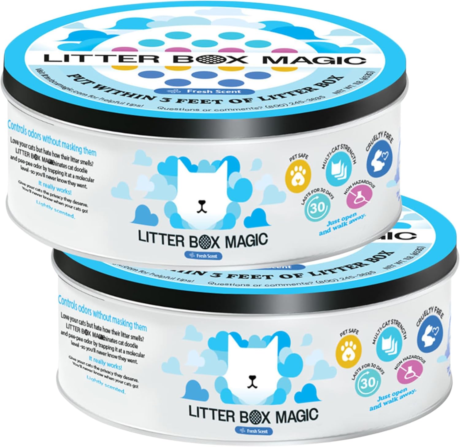 - MAXIMUM STRENGTH & LONG-LASTING; Up to 30 days of odor control β This cat box deodorizer pro-grade strength formula delivers powerful litter box odor control for up to 30 days, even in multi-cat households. Twist open the cat litter scent deodorizer jar and let it go to workβperfect for bathrooms, closets, enclosed basements, and small, poorly ventilated areas. With its continuous odor-fighting power, enjoy up to 30 days of effective odor elimination.