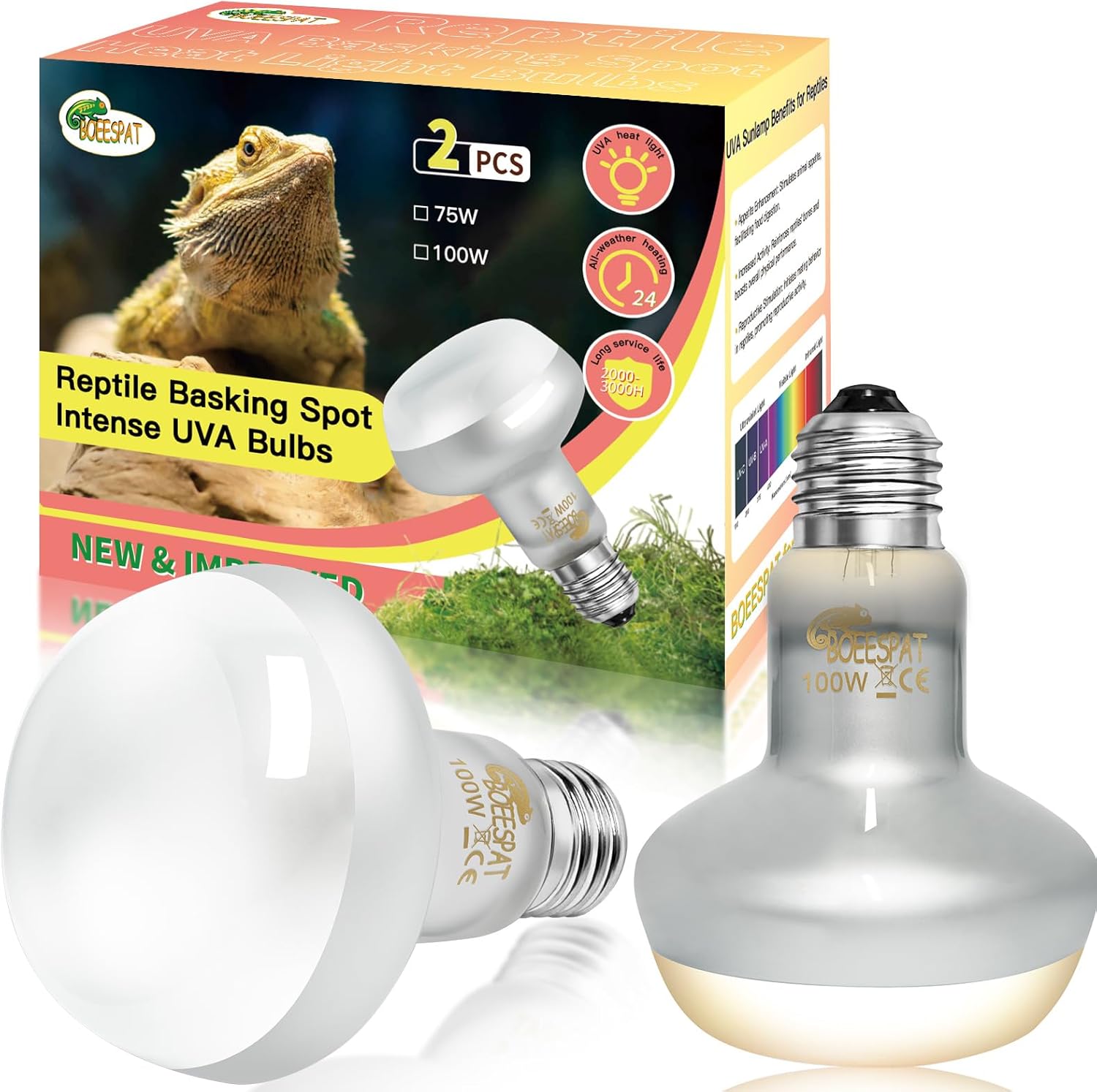 Intense 100W UVA Spotlight Heat Lamp Bulbs for Reptile Basking and Terrariums - Ideal for Desert-Dwelling Reptiles Like Bearded Dragons, Geckos, Iguanas, Lizards, Amphibians (Pack of 2)