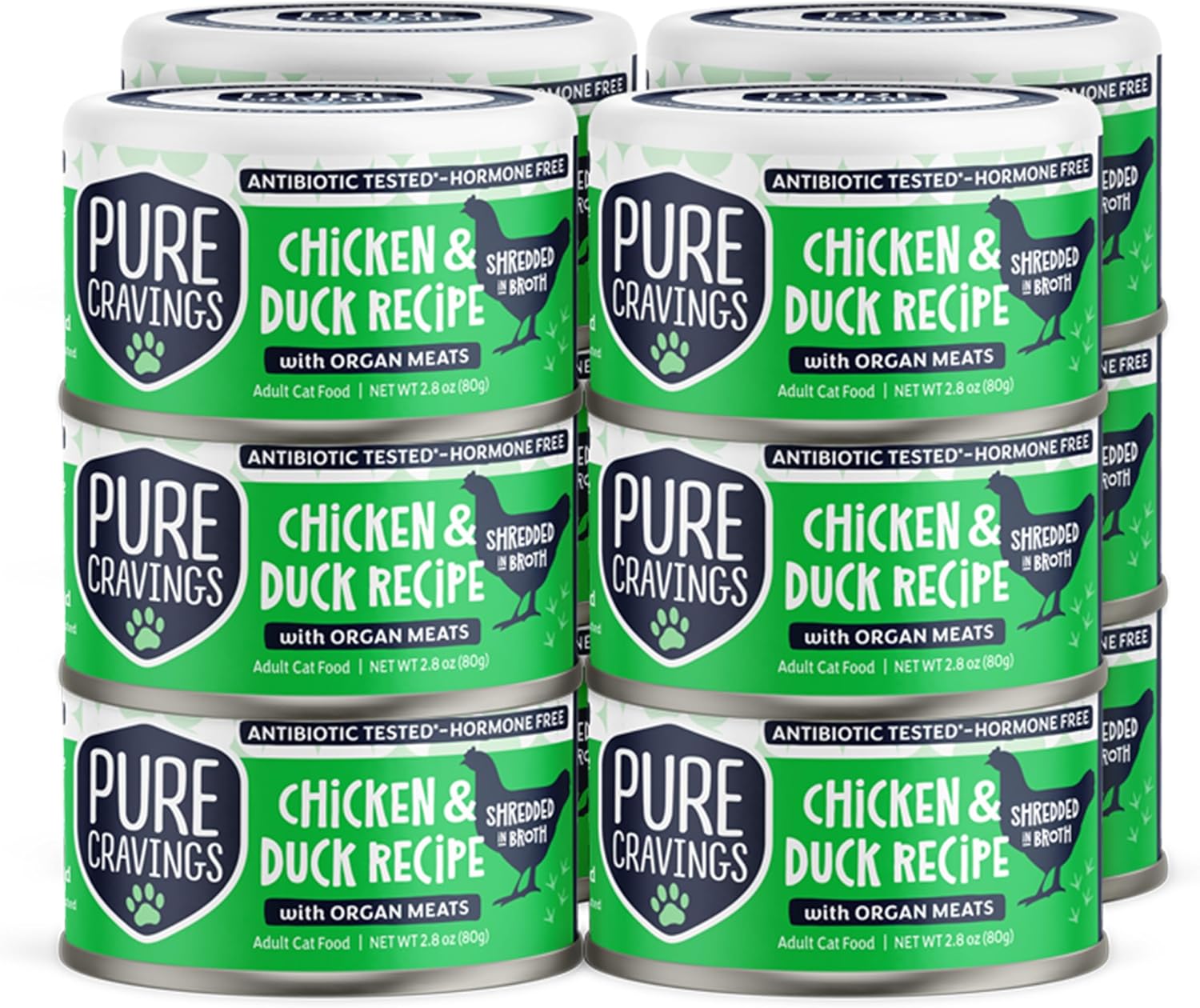- GOURMET FOOD FOR CATS β Treat your furry companion to the finest dining experience with our premium Shredded Chicken with Organ Meats in Broth, featuring a variety of tantalizing recipes including topped with Chicken, Duck, Beef, or Lamb.