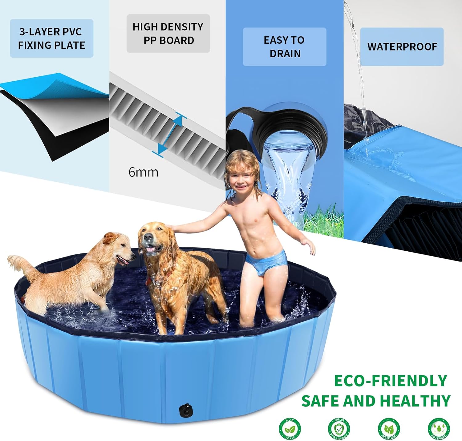 - πγSturdy Durable dog poolγοΌThe kids pool is made of 0.5mm thickened PVC material and built-in 6mm high-strength PP hard plastic board which is thicker than ordinary fiberboard, ensuring that the hard plastic pool is not prone to toppling over. The anti-skid bottom can prevent your pets from slipping when they jump around in the foldable pool.