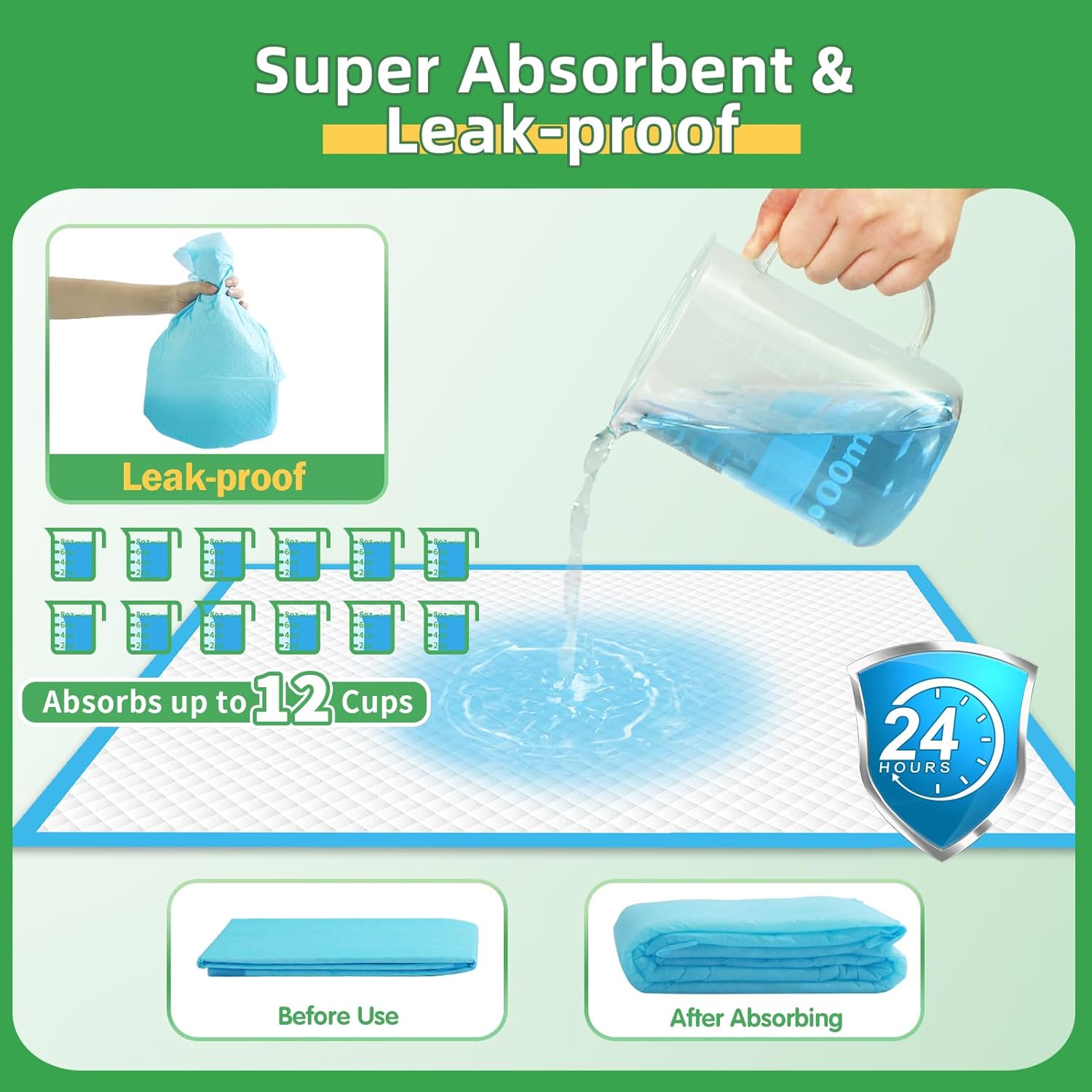 - Leak-proof Protection to Keep Your Home Clean: Each of large dog potty pads features the new upgraded plastic backing (thickened PE film) which is much more leak-proof, tear-resistant, and durable than most pet training pads in the market as the last-layer of the puppy pads. It can protect your floors, carpets, sofas, chairs, mattresses, beds, etc. from the urine damage by blocking leaks. It holds up to 12 cups of liquid.
