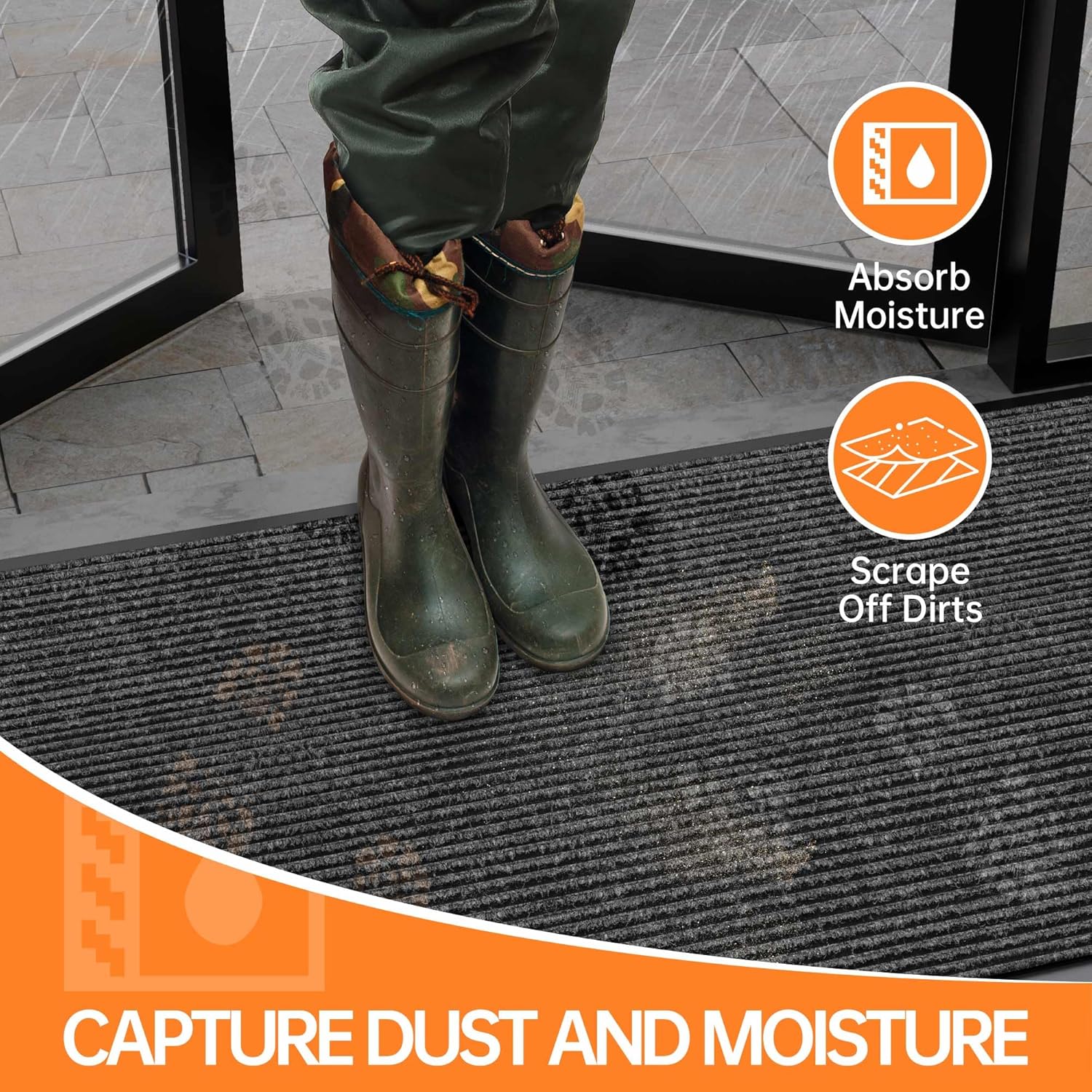 - Deep Grooves Capture Dirt and Moisture: Say goodbye to dirt and moisture tracked into your home. Our front door mat effectively captures dirt, mud and moisture from shoes, keeping your floors clean and protecting them from potential damage.