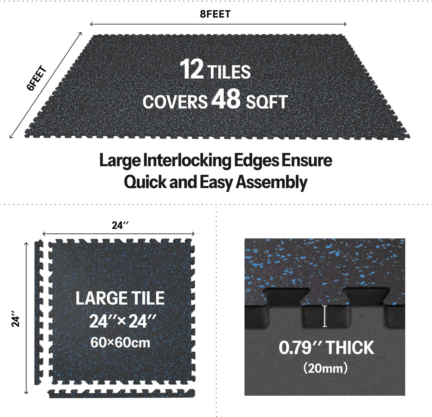 - [Easy to Assemble and Detach]: 12 tiles (24" x 24" x 0.79" each), covers 48 sq ft (8 Γ 6 ft). Upgraded larger interlocking locks provide a secure fit, preventing any separation during use, ensuring you can work out without concerns of shifting. Simple assembly and detachment make it effortless to set up your home gym.