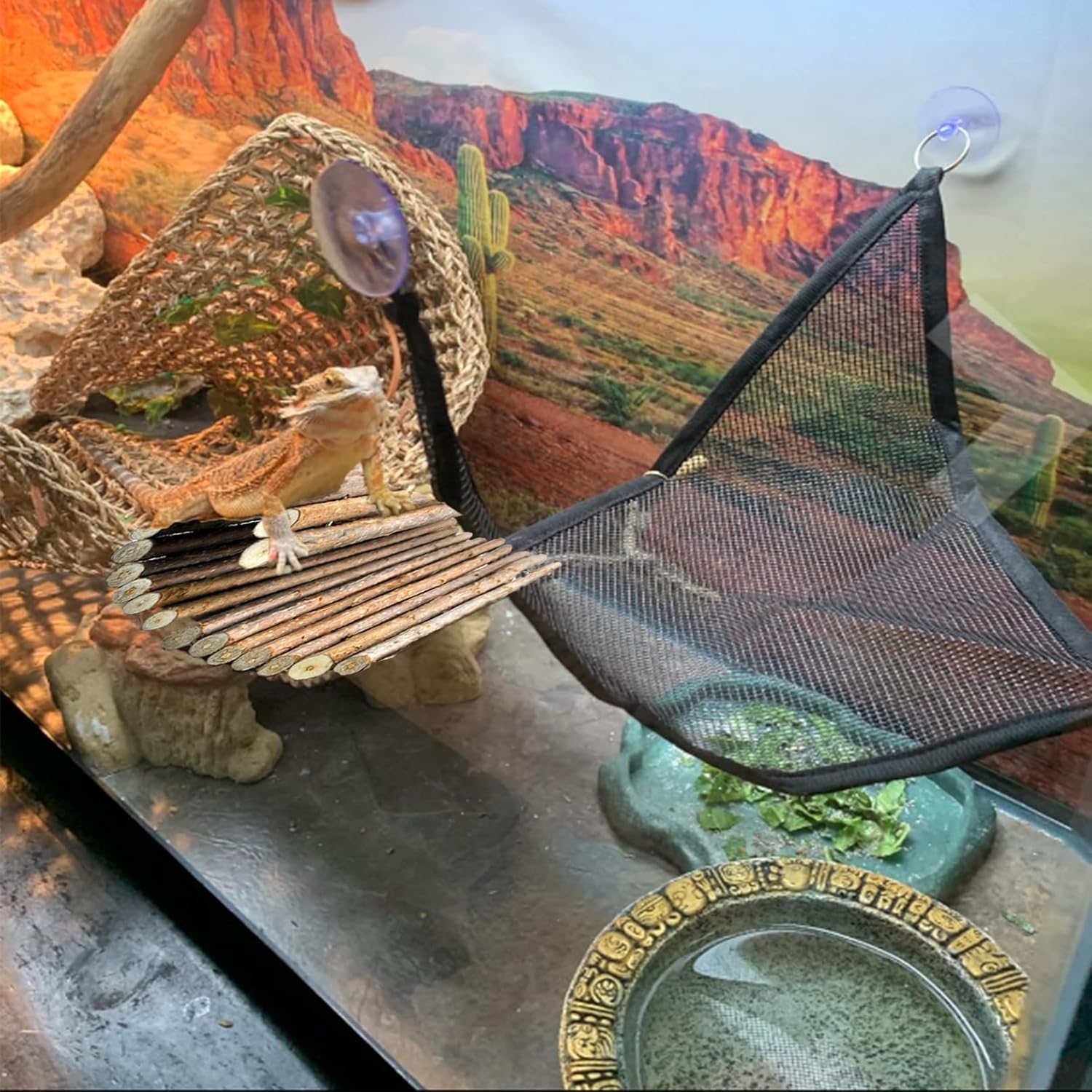 - 【Package Included】Reptile tank accessories include 1 Pcs crested gecko wooden bridge(15.7 x 6.0 inches/40 x 15 cm)、1 Pcs reptile rectangular hammock(15.7 x 6.7 inches/40 x 17 cm)、1 Pcs reptile vine plants (33.46 inches/85cm)、1 Pcs fexible leaves decor(78.74in/200cm) 、1 Pcs flexible rattan decoration(78.74in/200cm)、six clasps and five suction cups.