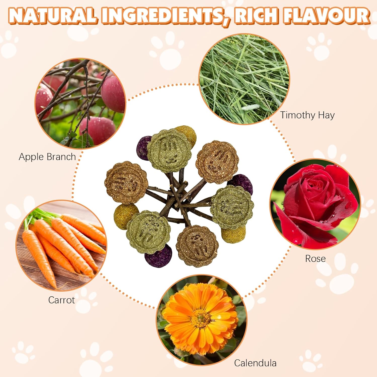 - πΎ [Rich in Flavour]: Rabbit chew sticks package includes 3 x rose lollipops, 3 x calendula lollipops, 3 x timothy hay lollipops, 3 x bunny pattern timothy hay lollipops and 3 x bunny pattern carrot lollipops.