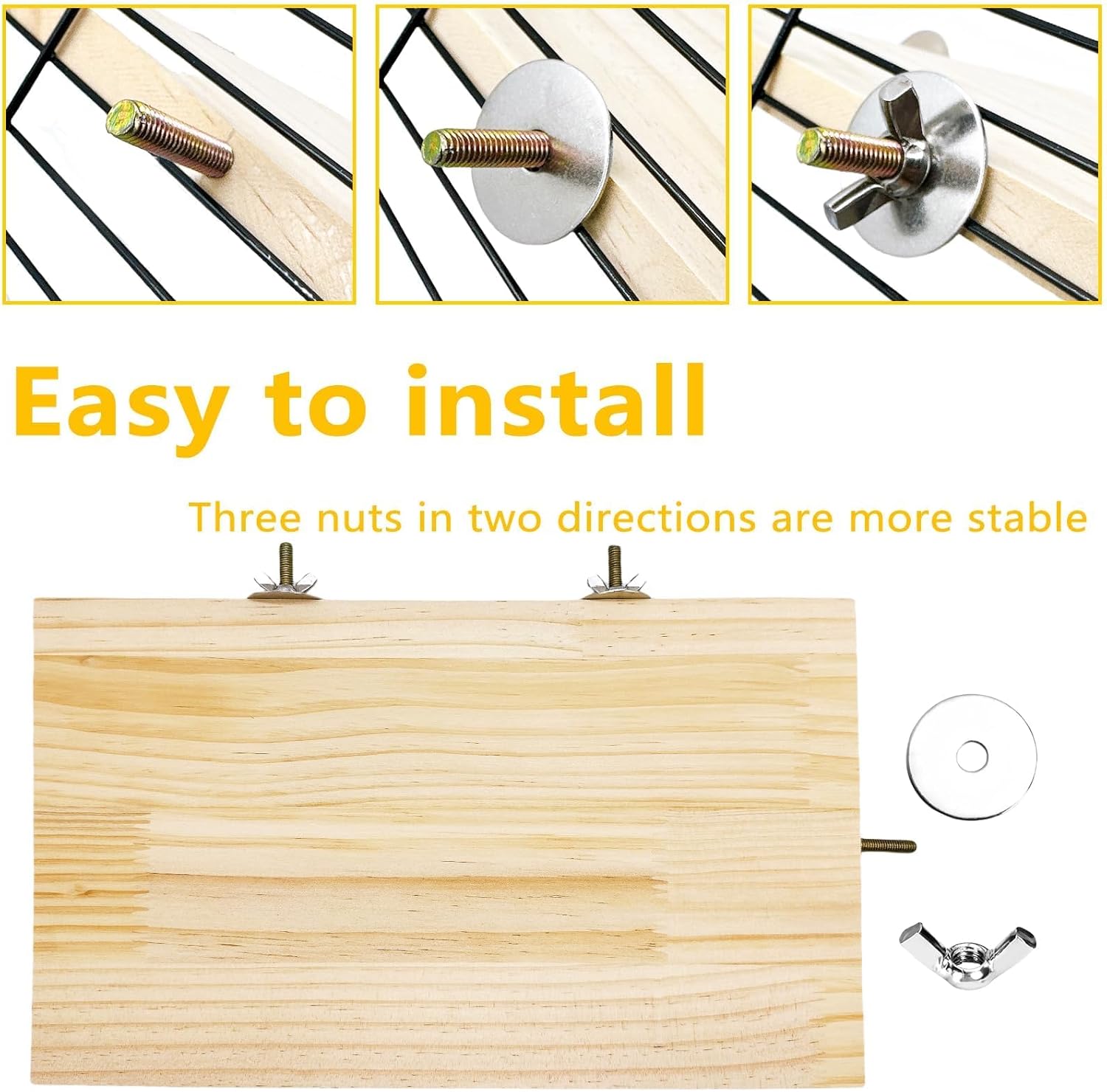 - 【Easy Installation】Each platform includes 3 metal washers and 3 nuts. When installing, simply adjust the platform to the proper position of the cage and tighten the nuts.Whether your chinchilla wants to lounge, your hamster wants to run, or your bird wants to perch, give your pets a comfortable and engaging space with the wooden platform ledge.