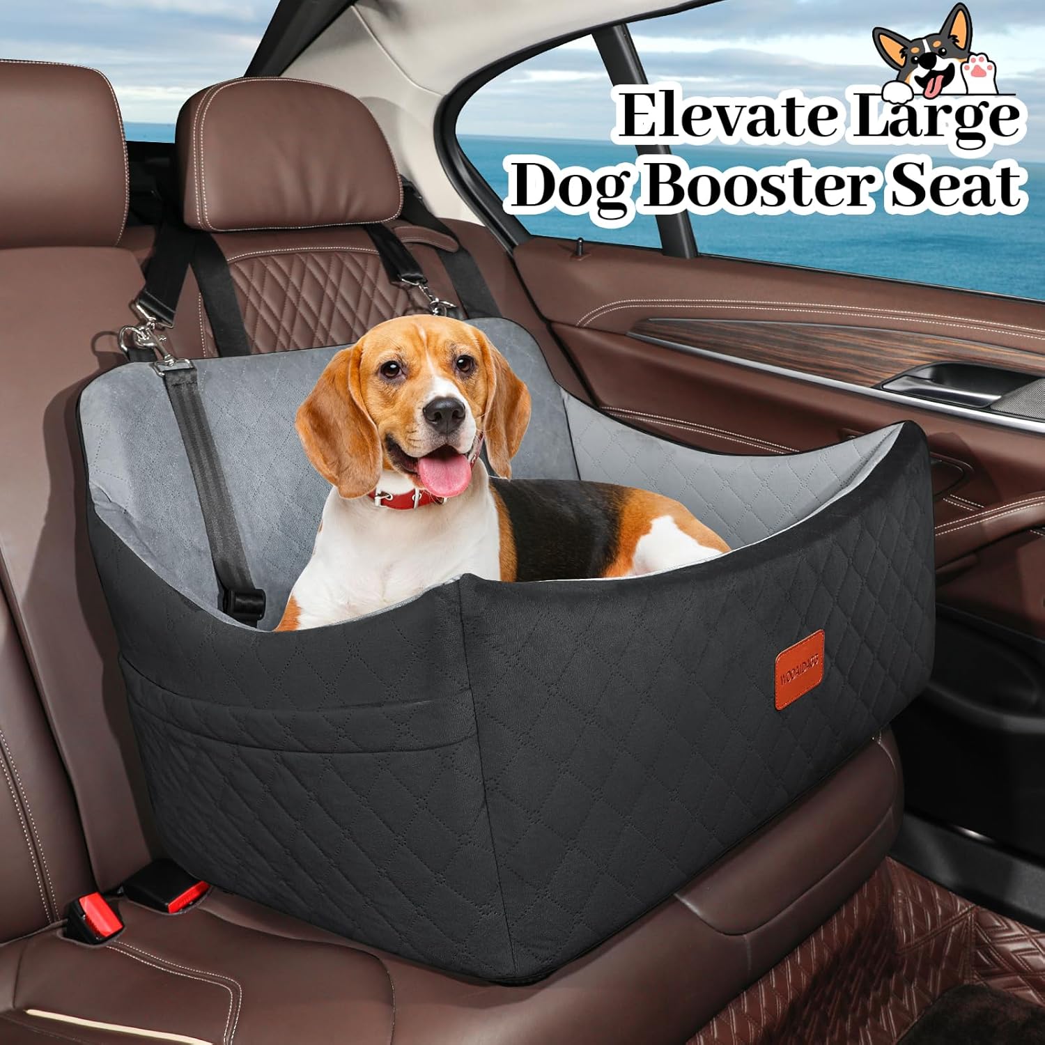 Dog Car Seat for Medium & Large Dogs Up to 55lbs, Memory Foam Cushion, Washable Cover, Safety Straps & Non-Slip Base(Black/Grey,Large)