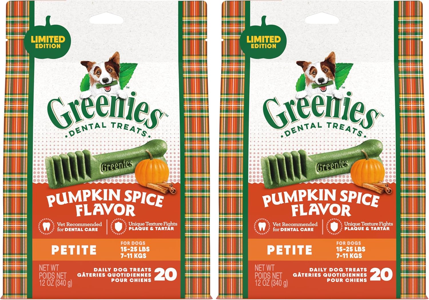 - 20-Count Pack: Contains one (1) 12 oz. 20-count pack of Greenies Pumpkin Spice Flavor Petite Size, Veterinarian-Recommended for Dental Care, Dog Treat Chews, Limited Edition