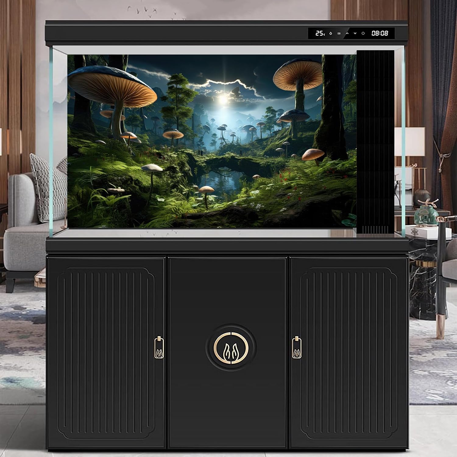 Fantasy Mushrooms Landscape Aquarium Background Tranquil Stream Cloudy Sky Terrarium Background Lush Green Tropical Plants Trees Fish Tank Backdrop Decoration Tank Background Poster 30x18in