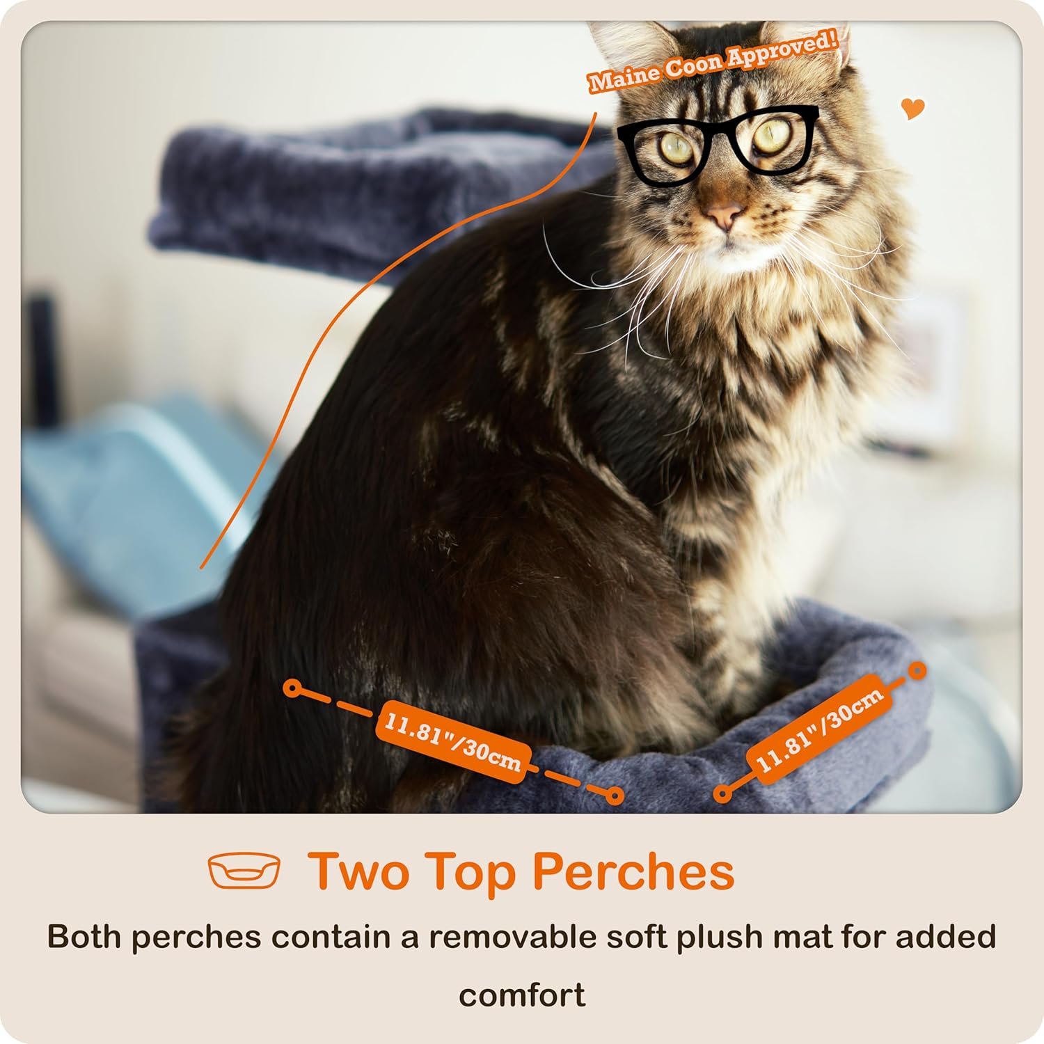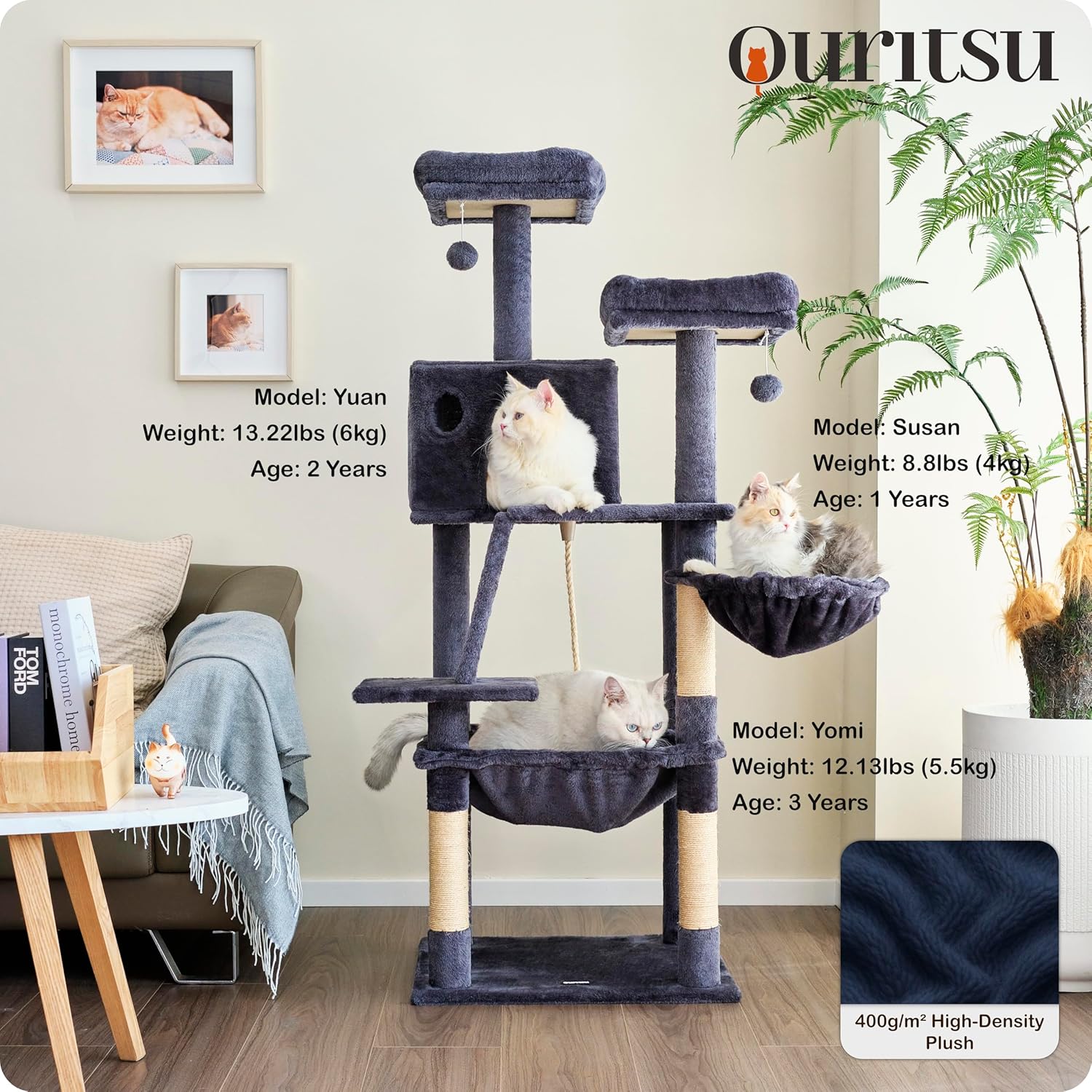 - [All-in-One Comfort & Fun] This cat climbing tower is packed with features and wrapped in soft 400g/mΒ² plush fabric for a cozy experience. The sturdy steel-framed cat tree hammock on the second level offers a secure and comfy resting spot, while the scratching ramp to the third level provides both scratching and easy access for kittens, adult cats, and seniors. A perfect cat tree for indoor cats