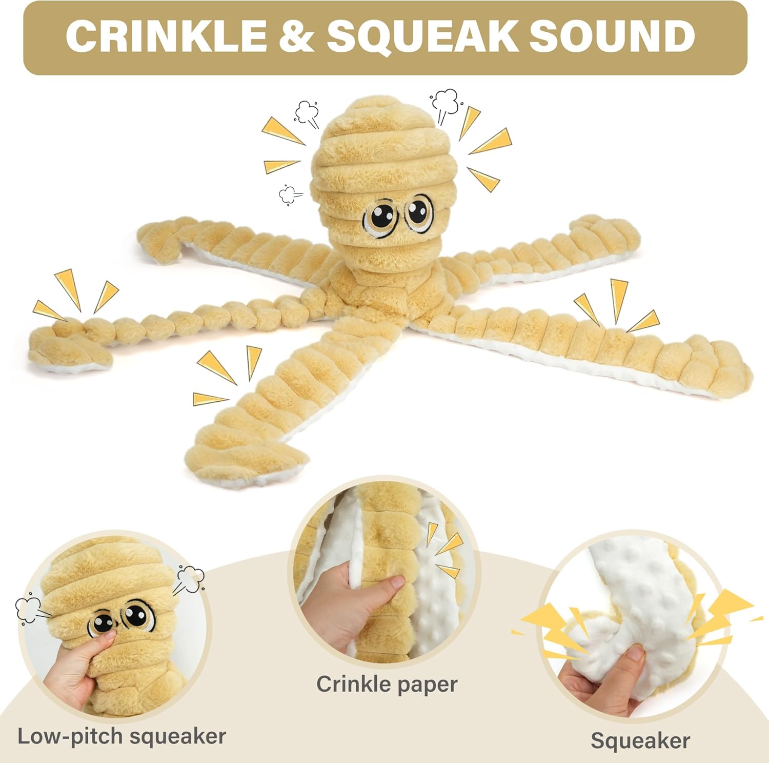 - Squeaky and Crinkle Dog Toys: Each octopus dog toy features a stuffed head with a low-pitch squeaker, and 5 legs with crinkle paper and squeaker at the tip; satisfies your pets’ natural hunting & chewing instincts and provides extra fun when they bite and play